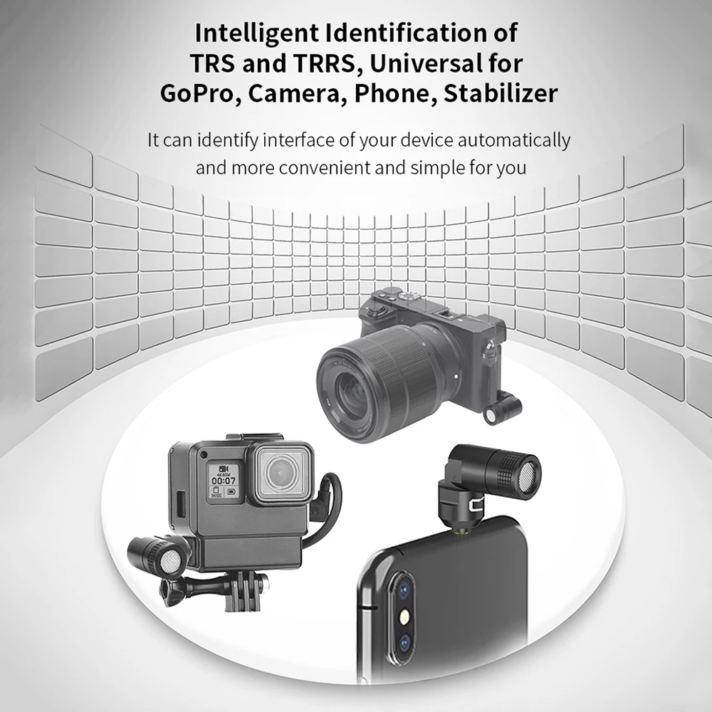 Интеллектуальная идентификация TRS и TRRS:Этот мини-микрофон может определить интерфейс (3,5 мм ТРС/TRRS) вашего устройства автоматически. Универсальный для GoPro, DSLR Camera, смартфона и стабилизатора