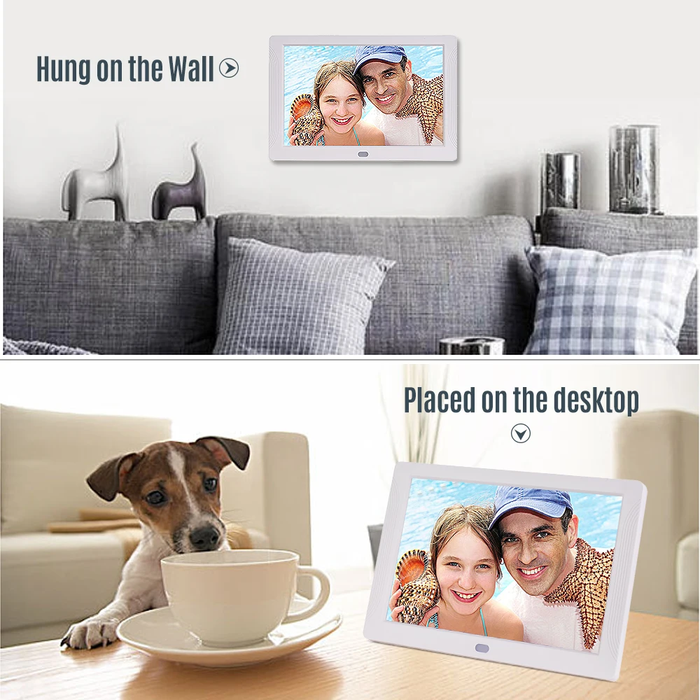 Plug and play, легко управлять цифровой фоторамкой через клавиши на задней стороне или с помощью пульта дистанционного управления. Он предназначен для размещения дома или в офисе, а также может быть размещен на столешнице/полке или подвешен на стене.