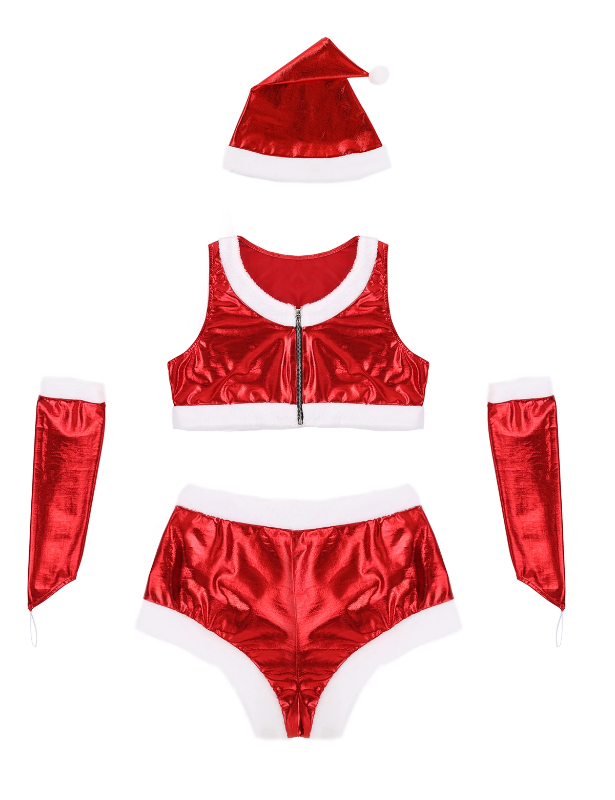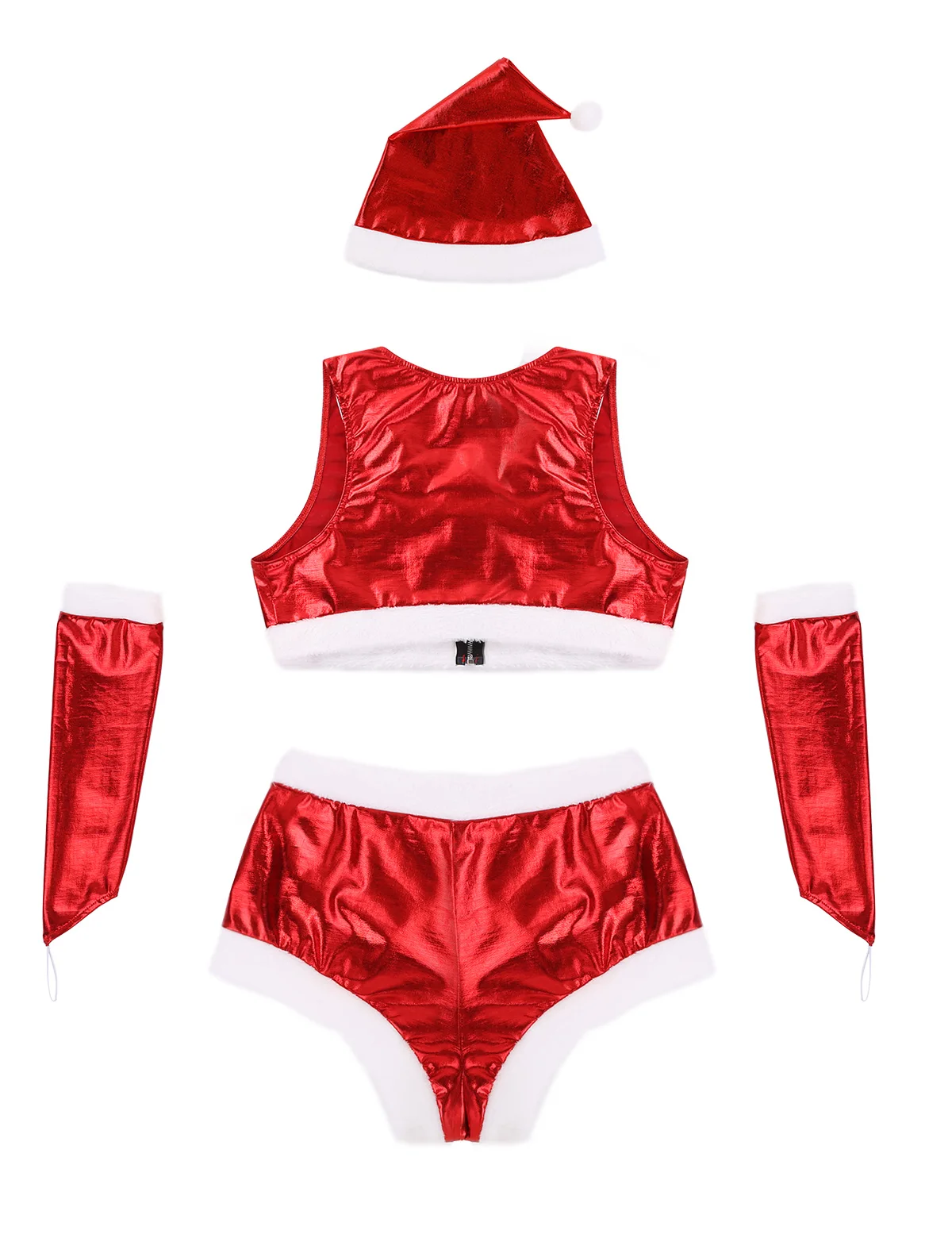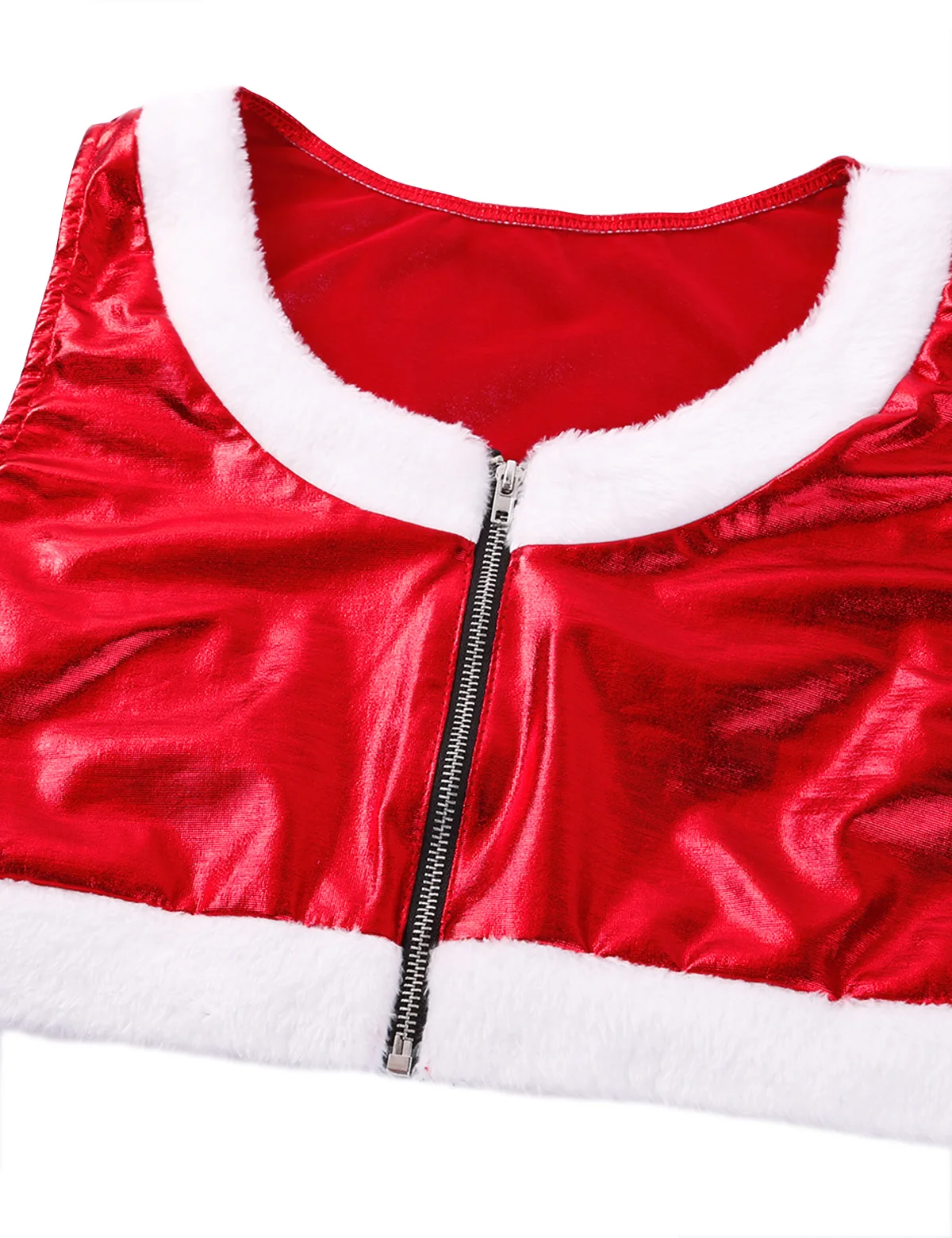 Блестящий металлический стиль, белая фланелевая отделка, укороченный топ без рукавов на молнии спереди и шорты на молнии с пряжкой спереди.