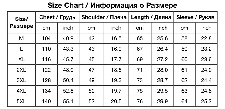 1) обратите внимание, что для данного товара мы применяли Азиатские размеры, Азиатские размеры обычно на 2 размера меньше размеров США/ЕС/Австралии. Азиатские размеры M аналогичны европейским, американским и австралийским размерам XS, Азиатский размер L похож на Европейский/американский/Австралийский Размер S, Азиатский размер XL похож на Европейский/американский/Австралийский Размер M, Азиатские размеры XXL аналогичны европейским, американским и австралийским размерам L, Азиатский размер 3XL похож на Европейский/американский/Австралийский Размер XL, Азиатские размеры 4XL аналогичны европейским, американским и австралийским размерам XXL, Азиатский размер 5XL похож на Европейский/американский/Австралийский Размер 3XL, 2) свяжитесь с нами, если вам нужен размер. 3) замеры сделаны вручную, поэтому возможны отклонения в размере от 1 до 3 см. 4) обратите внимание, что различия в цвете могут быть вызваны некоторыми причинами, такими как отражение цвета на мониторе, освещение, фон и т. д.