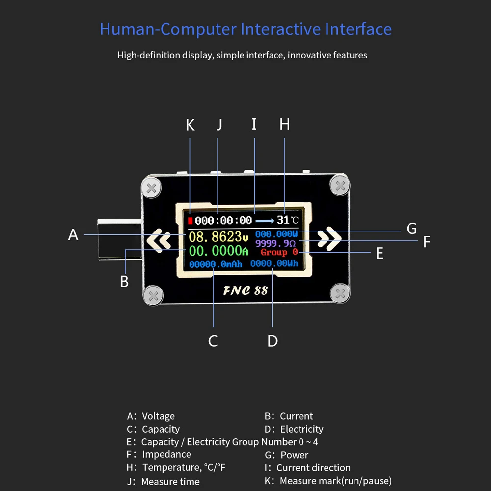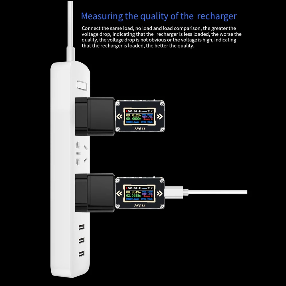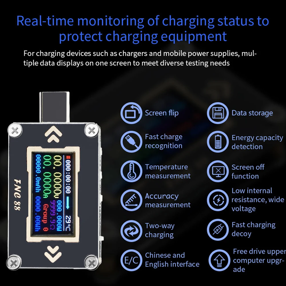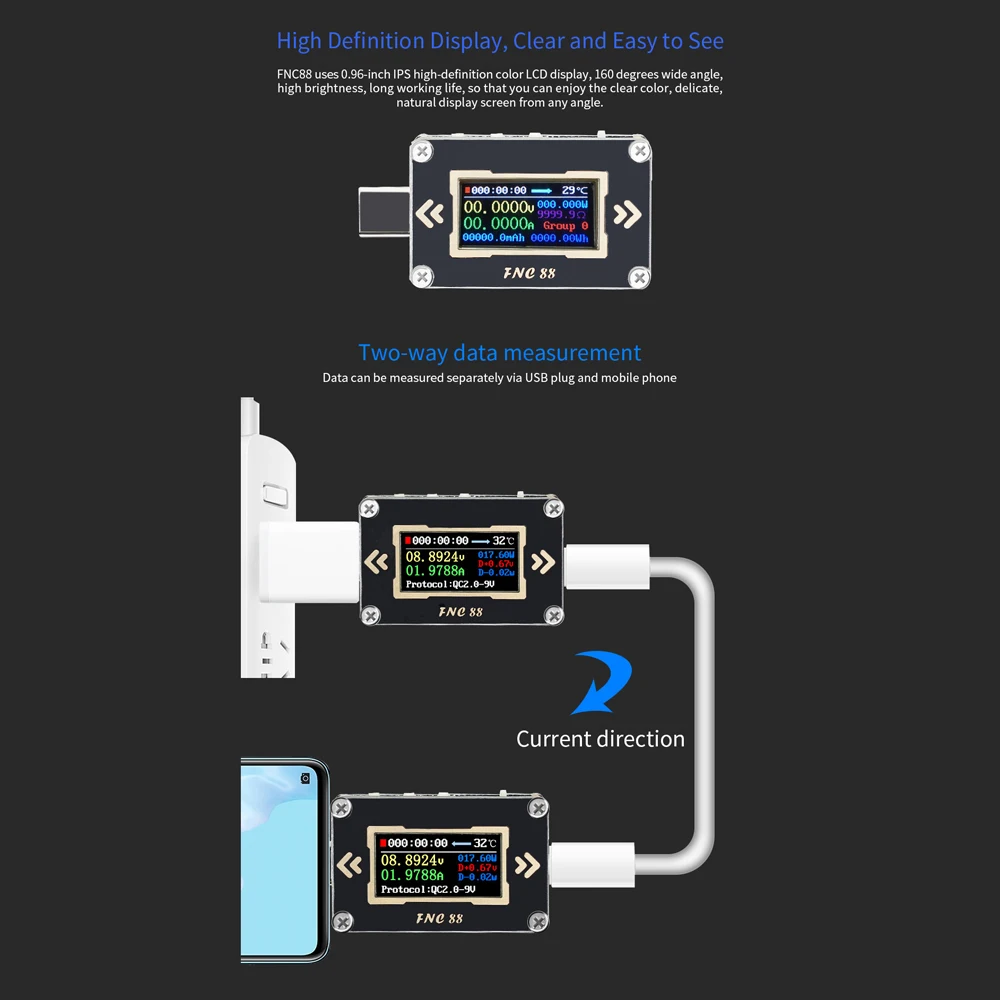 Отключение питания, данные гарантированы. FNC88 имеет функцию отключения питания. Когда мобильный источник питания отключен, он может хранить данные о емкости и энергии, что удобно для дальнейшего просмотра и измерения мощности энергии мобильного источника питания.
