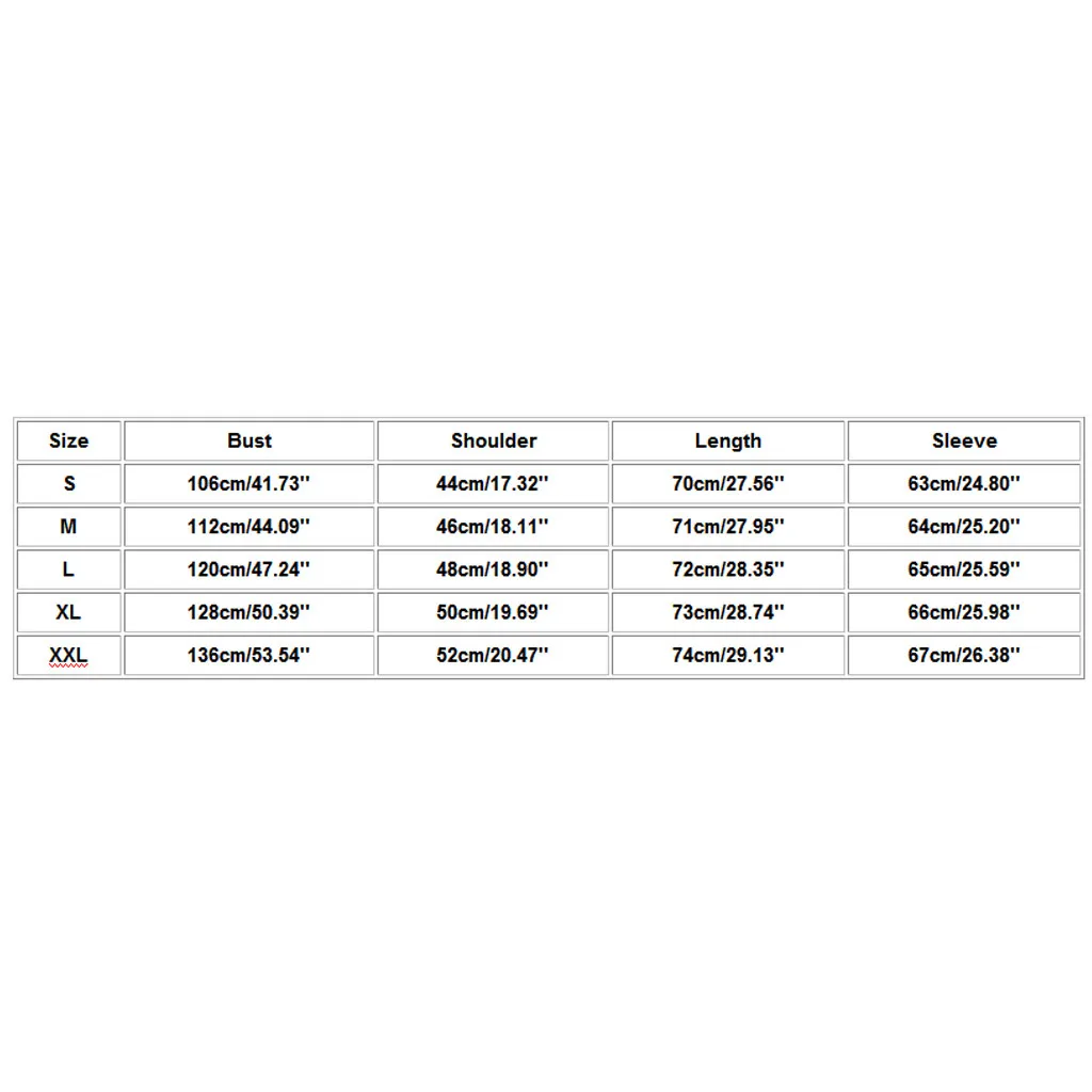 РазмерБюстПлечоДлинаРукавS106 см/41,73''44 см/17,32''70 см/27,56''63 см/24,80''М112 см/44,09''46 см/18,11''71 см/27,95''64 см/25,20''L120 см/47,24''48 см/18,90''72 см/28,35''65 см/25,59''XL128 см/50,39''50 см/19,69''73 см/28,74''66 см/25,98''XXL136 см/53,54''52 см/20,47''74 см/29,13''67 см/26,38''