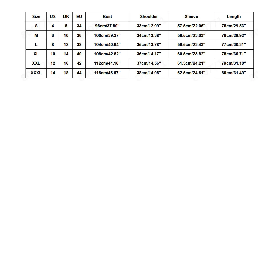 Размер Свяжитесь с нами Великобритания ЕС Обхват груди Сумка на плечо Рукава Длина S 4 8 34 96 см/37,80'' 33 см/12,99'' 57,5 см/22,06'' 75 см/29,53'' М 6 10 36 100 см/39,37'' 34 см/13,38'' 58,5 см/23,03'' 76 см/29,92'' L 8 12 38 104 см/40,94'' 35 см/13,78'' 59,5 см/23,43'' 77 см/30,31'' XL 10 14 40 108 см/42,52'' 36 см/14,17'' 60,5 см/23,82'' 78 см/30,71'' XXL 12 16 42 112 см/44,10'' 37 см/14,56'' 61,5 см/24,21'' 79 см/31,10'' XХХL 14 18 44 116 см/45,67'' 38 см/14,96'' 62,5 см/24,61'' 80 см/31,49''