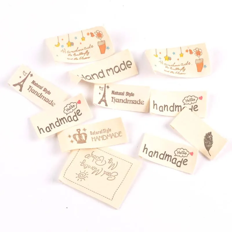 Смешанные 50 шт ручной работы напечатанные бежевые хлопковые тканые этикетки для одежды, этикетки для ухода, Мультяшные сумки для обуви, моющиеся бирки для одежды CP2395