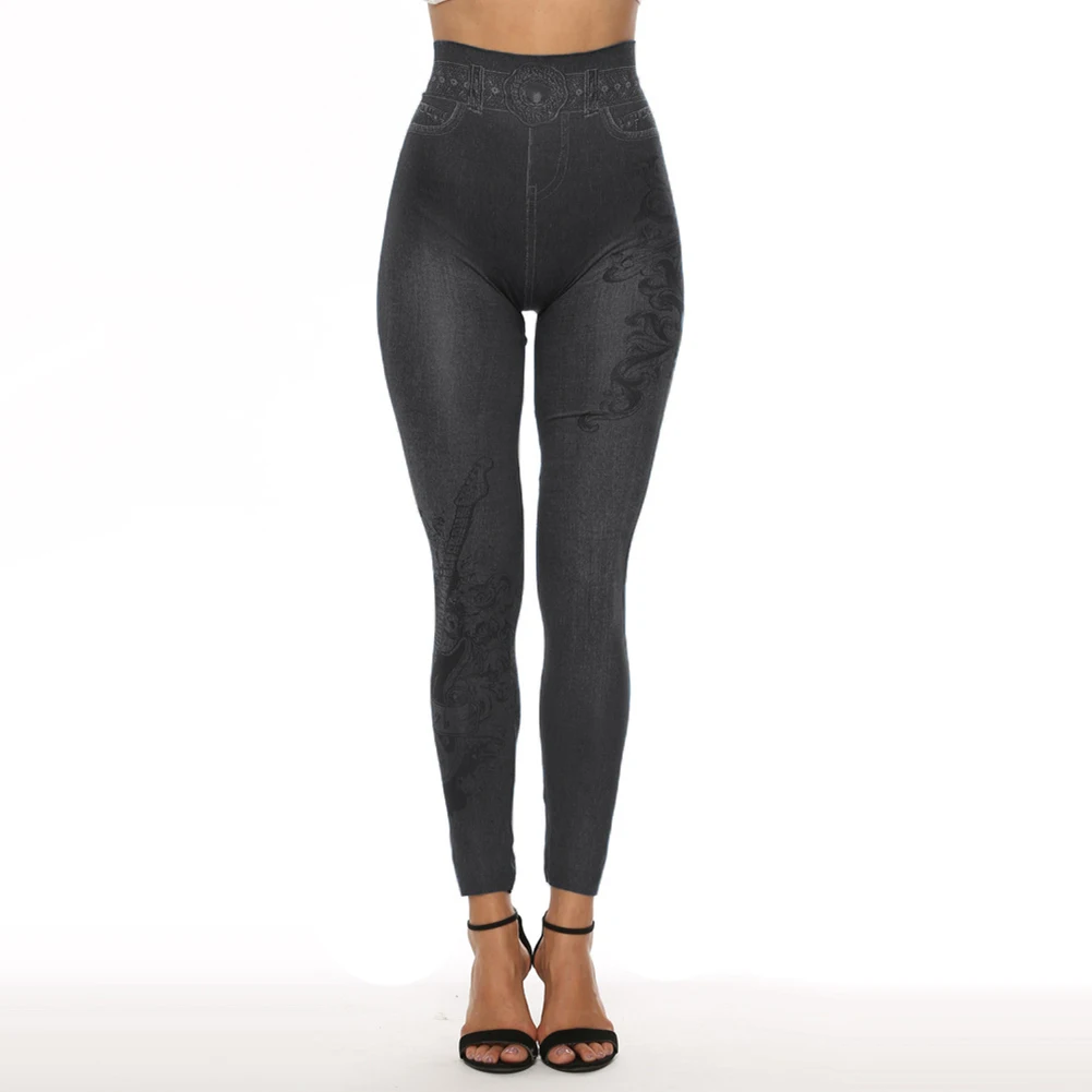 Особенности: эластичные, обтягивающие, удобные, с подъемом на бедрах, имитация джинсовой ткани