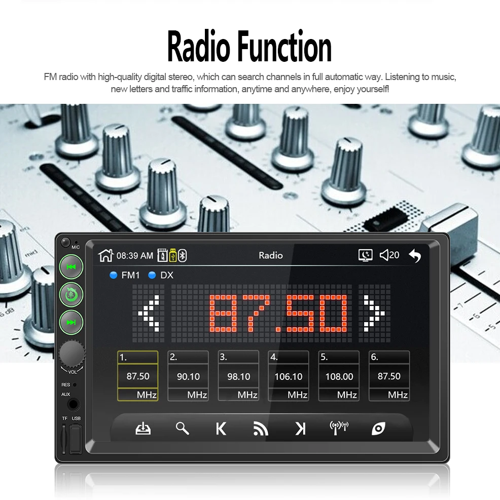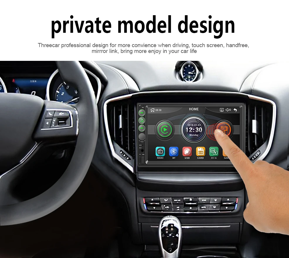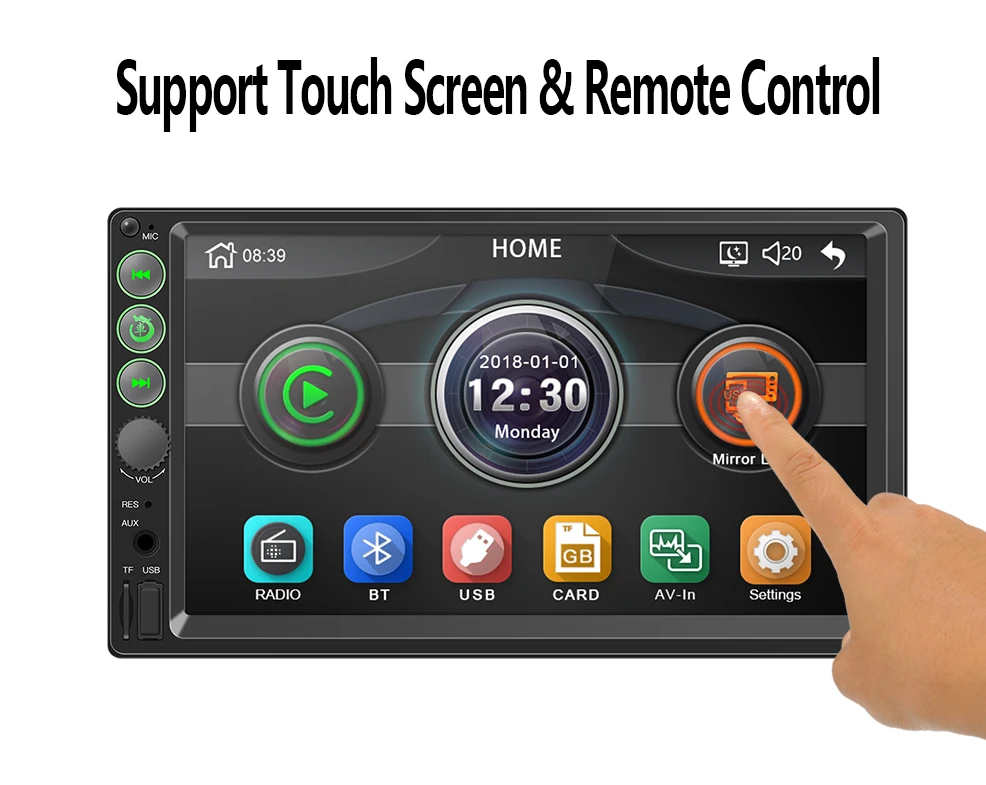 -7-дюймовый HD сенсорный экран TFT монитор, поддержка 1208*720 RMVB формате высокой четкости. -Поддержка громкой связи. -Поддержка bluetooth аудио музыки. -Высокочувствительный сенсорный экран. -Поддержка tf-карты, Aux, функции радио. -Поддержка USB Выходная мощность на мобильный телефон или другие usb-устройства -50 Вт x 4 Максимальная мощность, бас/высокие частоты/баланс/фейдер. -Он не может воспроизводить DVD / CD. -Поддержка радио. -Поддержка настройки мультипельных звуковых эффектов.