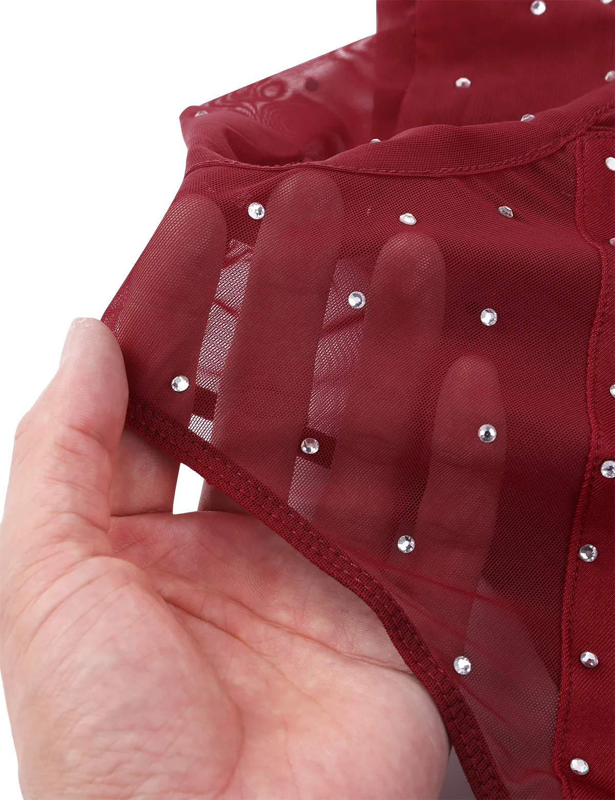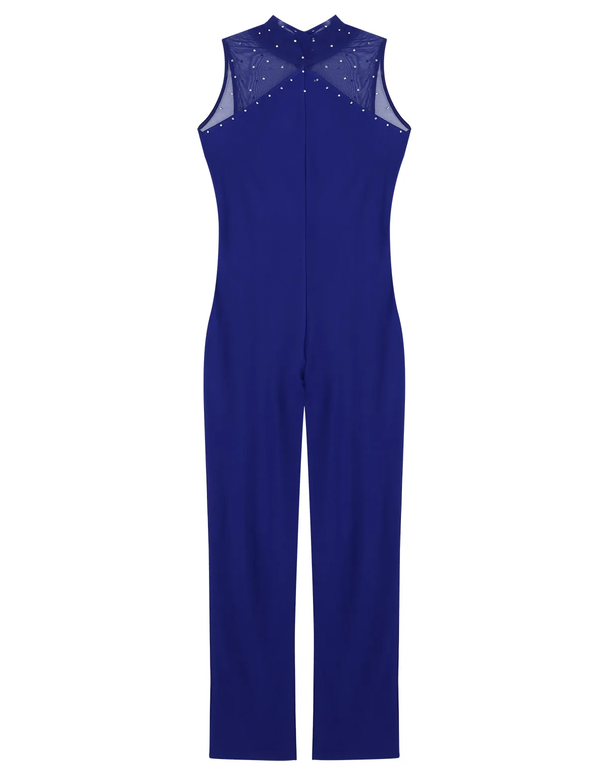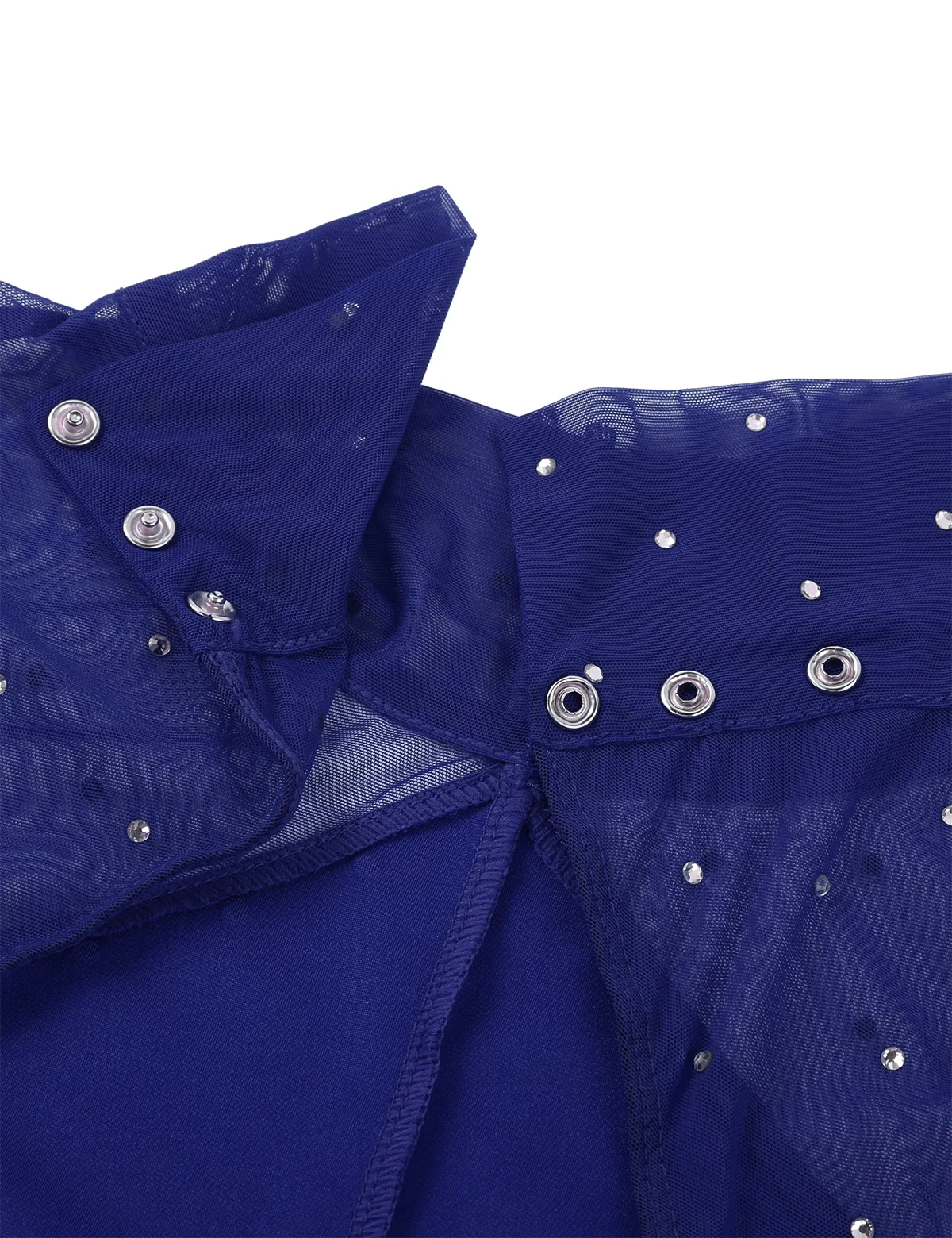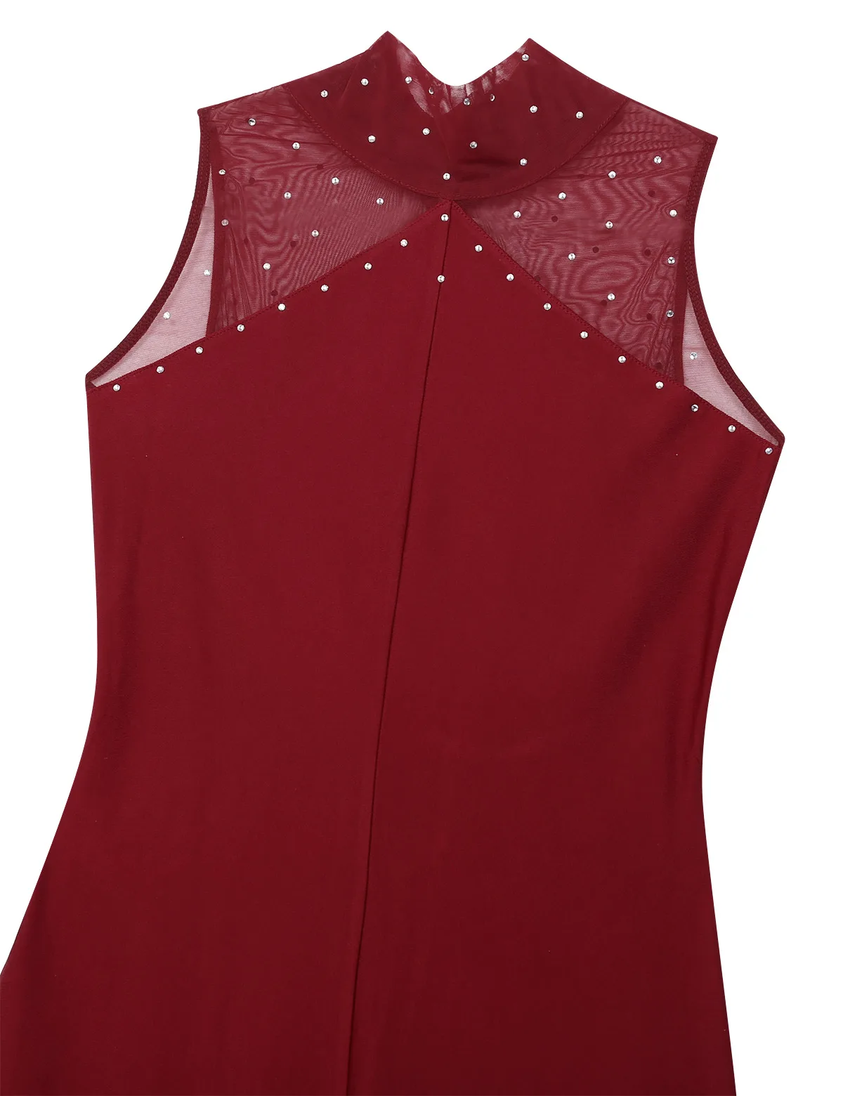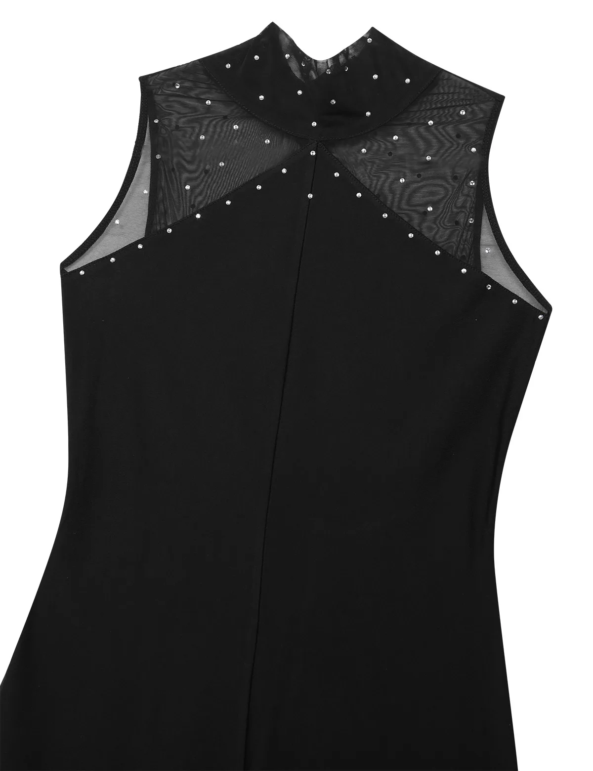 Высокая горловина, без рукавов и отверстие для ключа сзади, из сетчатой ткани, с верхней части плеча украшен блестящие стразы, стройная фигура.