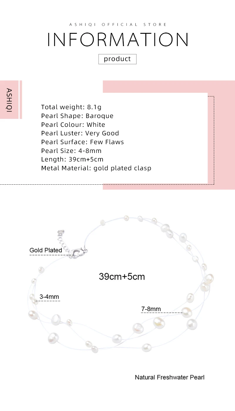 Бренд: ASHIQI Тип камня: натуральный пресноводный жемчуг Общий вес: 8,1 г Форма жемчуга: барокко Цвет жемчуга: белый Жемчужный Блеск: очень хорошо Поверхность жемчуга: несколько недостатков Размер жемчуга: 4-8 мм Длина: 39 см + 5 см Материал металла: позолоченная застежка Упаковка: Подарочная коробка/Сумка Длина ожерелья: измеряется от начала до конца, исключая удлинительные цепочки. Например, 39 см + 5 см (удлинительная цепь)