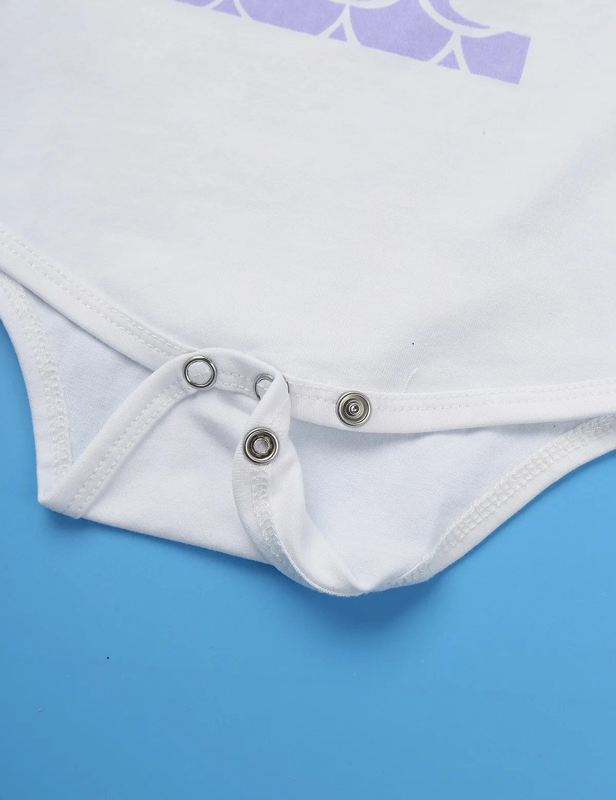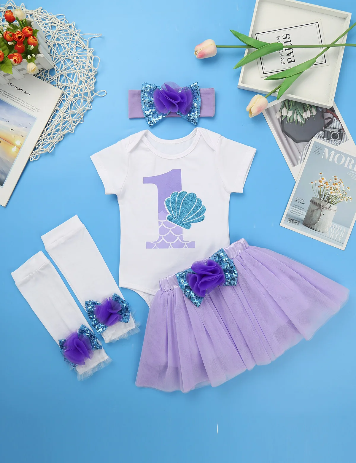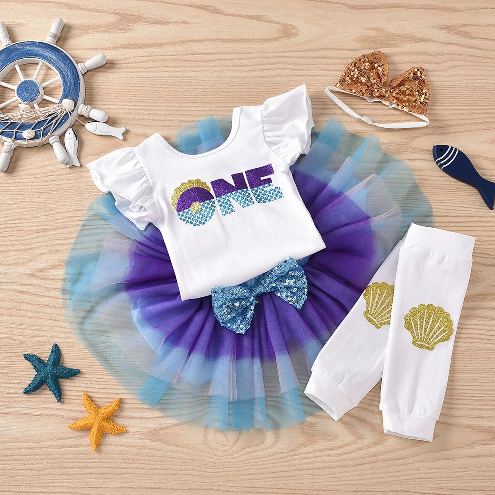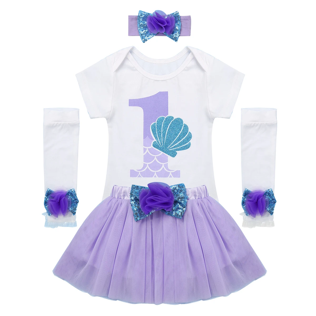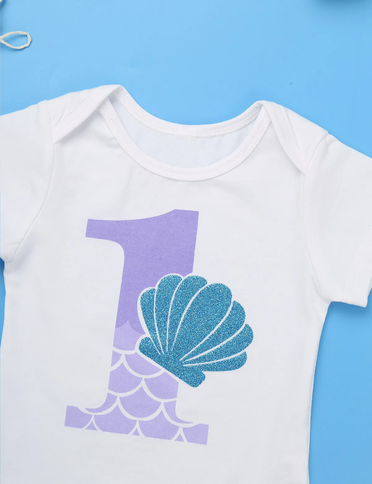 Короткие рукава, плечи с рюшами, спереди принт с цифрой «1» и блестящим узором в виде ракушки. Нажмите кнопку закрытия внизу для легкой смены подгузников.