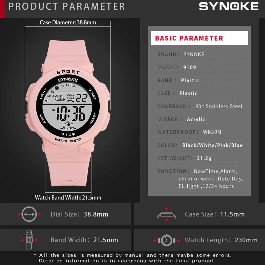 Диаметр корпуса: 38,8 мм Толщина циферблата: 11,5 мм Ремешок Длина: 230 мм (включая корпус) Материал ремешка: пластиковый ремешокВ комплект входит: