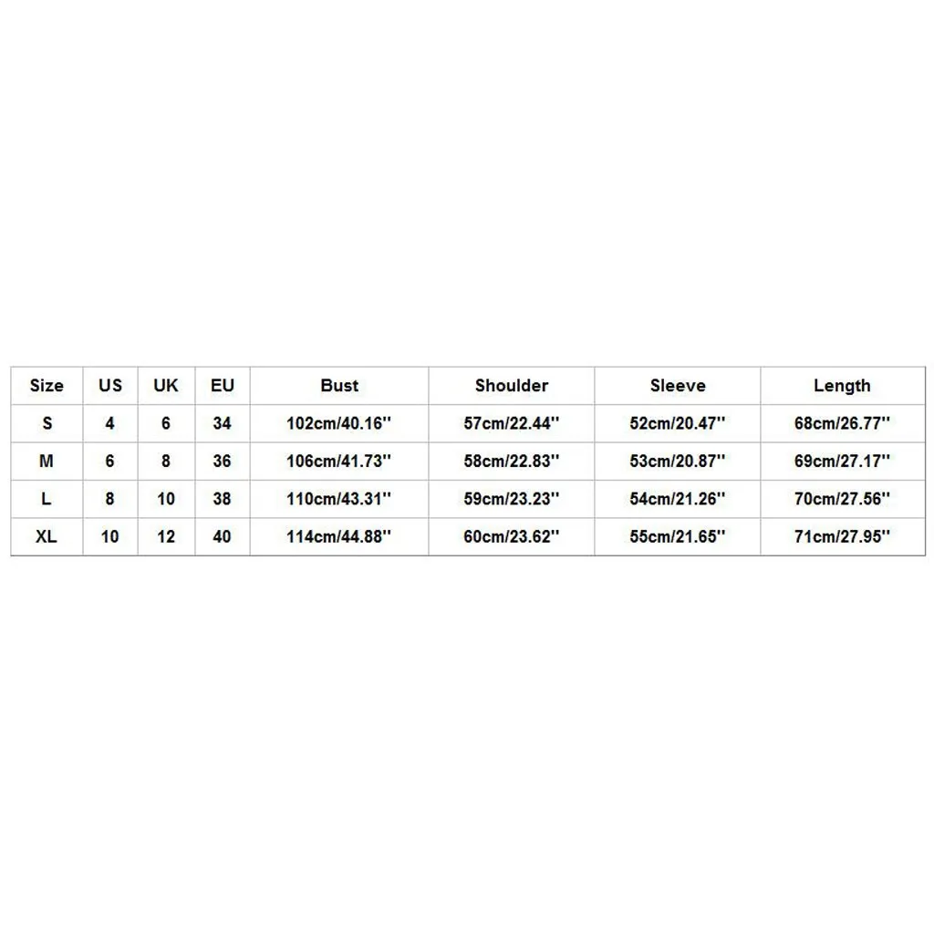 Что вы получаете: 1 шт женщиныУличном японском стилеРазмер Свяжитесь с нами Великобритания ЕС Обхват груди Сумка на плечо Рукава Длина S 4 6 34 102 см/40,16'' 57 см/22,44'' 52 см/20,47'' 68 см/26,77'' М 6 8 36 106 см/41,73'' 58 см/22,83'' 53 см/20,87'' 69 см/27,17'' L 8 10 38 110 см/43,31'' 59 см/23,23'' 54 см/21,26'' 70 см/27,56'' XL 10 12 40 114 см/44,88'' 60 см/23,62'' 55 см/21,65'' 71 см/27,95''