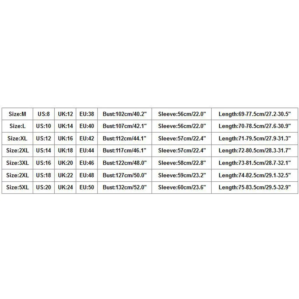 Что вы получаете: 1 шт. женский топ Размер Свяжитесь с нами Великобритания ЕС Обхват груди Рукава Длина М 8 12 38 102 см/40,2" 56 см/22,0" 69-77,5 см/27,2-30,5" L 10 14 40 107 см/42,1" 56 см/22,0" 70-78,5 см/27,6-30,9" XL 12 16 42 112 см/44,1" 57 см/22,4" 71-79,5 см/27,9-31,3" 2XL 14 18 44 117 см/46,1" 57 см/22,4" 72-80,5 см/28,3-31,7" 3XL 16 20 46 122 см/48,0" 58 см/22,8" 73-81,5 см/28,7-32,1" 2XL 18 22 48 127 см/50,0" 59 см/23,2" 74-82,5 см/29,1-32,5" 5XL 20 24 50 132 см/52,0" 60 см/23,6" 75-83,5 см/29,5-32,9"