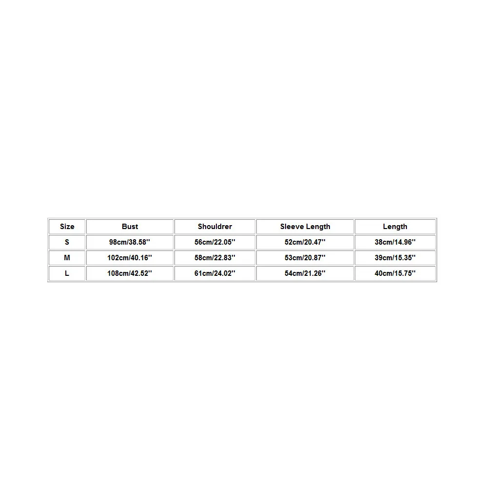 Размер Обхват груди Shouldrer Рукав Длина Длина S 98 см/38,58'' 56 см/22,05'' 52 см/20,47'' 38 см/14,96'' М 102 см/40,16'' 58 см/22,83'' 53 см/20,87'' 39 см/15,35'' L 108 см/42,52'' 61 см/24,02'' 54 см/21,26'' 40 см/15,75''