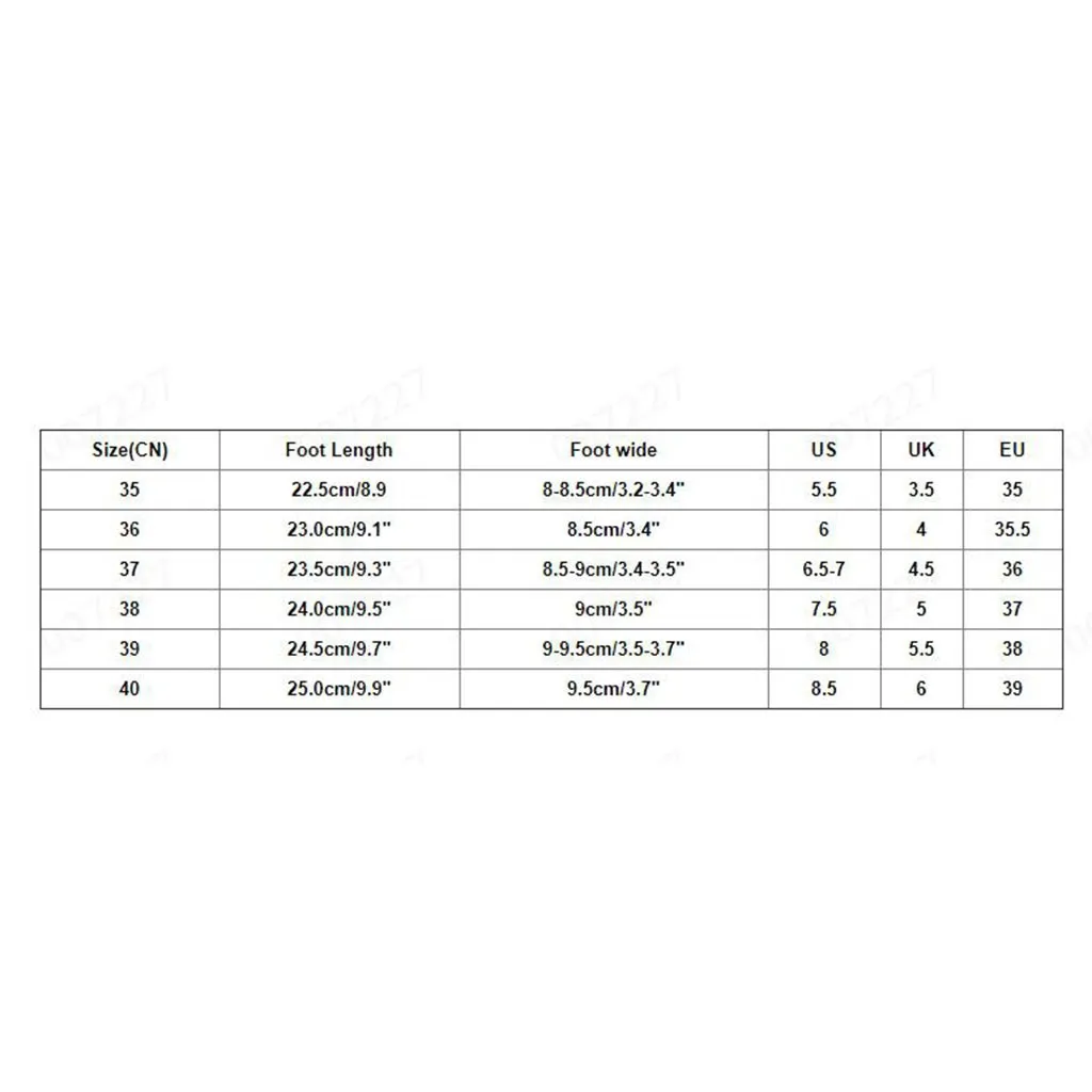 Упаковка: 1 пара женской обуви Размеры (CN) Foot Длина При покупке обувь на широкую ногу Свяжитесь с нами Великобритания ЕС 35 22,5 см/8,9" 8-8,5 см/3,2-3,4" 5,5 3,5 35 36 23,0 см/9,1" 8,5 см/3,4" 6 4 35,5 37 23,5 см/9,3" 8,5-9 см/3,4-3,5" 6,5-7 4,5 36 38 24,0 см/9,5" 9 см/3,5" 7,5 5 37 39 24,5 см/9,7" 9-9,5 см/3,5-3,7" 8 5,5 38 40 25,0 см/9,9" 9,5 см/3,7" 8,5 6 39