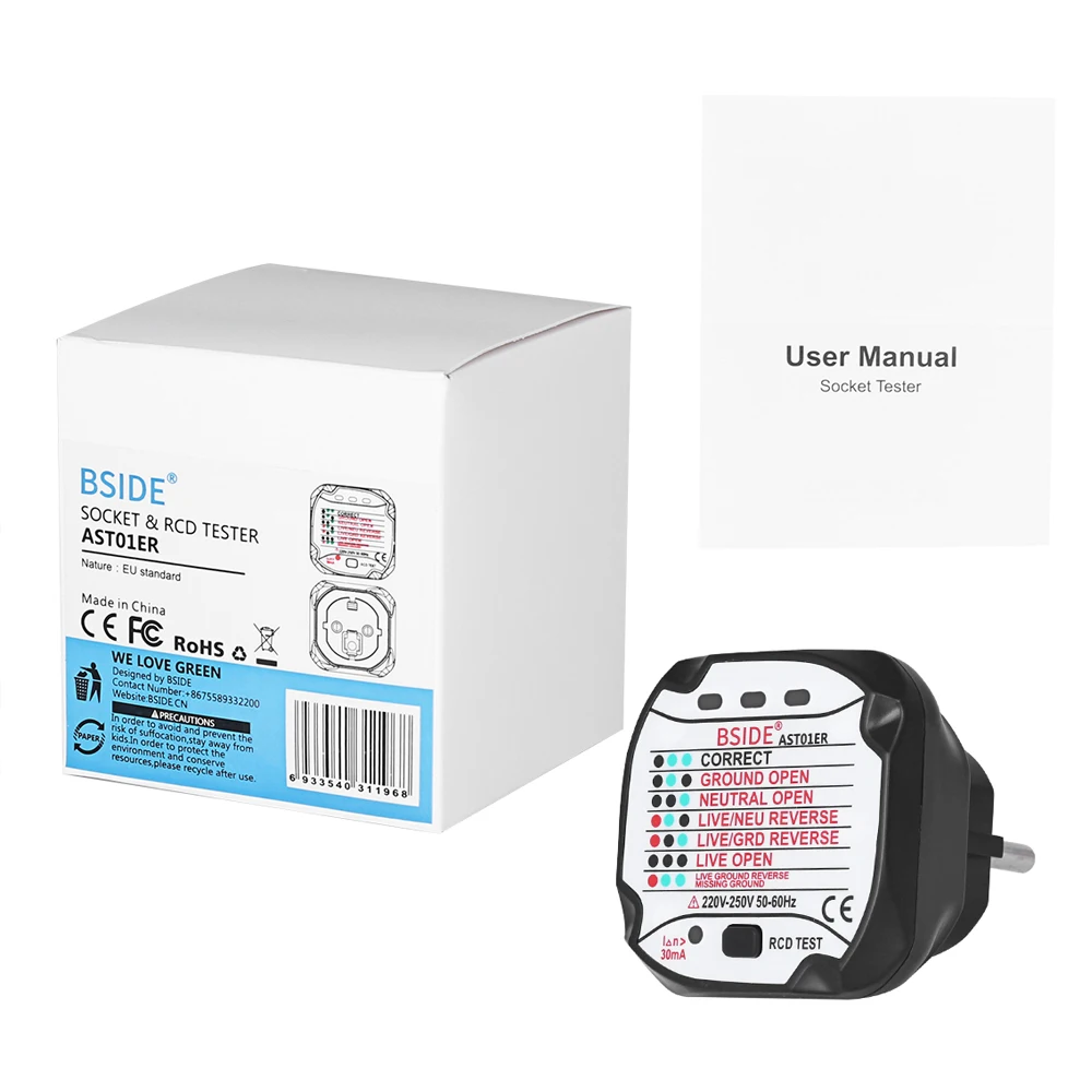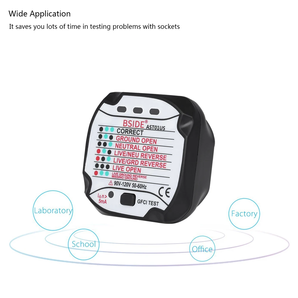 Широкое применение: в соответствии с CE, FCC, RoHS стандартом безопасности. В качестве общего инструмента измерения и широко используется в школе, лаборатории, фабрике и других социальных областях. Это экономит вам много времени для диагностики проблем с розетками.