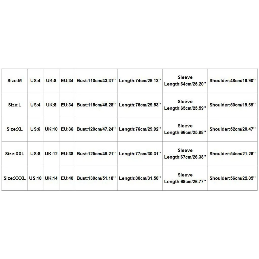 РазмерСШАВеликобританияЕСБюстДлинаДлина рукаваПлечоМ4834110 см/43,31''74 см/29,13''64 см/25,20''48 см/18,90''L4834115 см/45,28''75 см/29,53''65 см/25,59''50 см/19,69''XL61036120 см/47,24''76 см/29,92''66 см/25,98''52 см/20,47''XXL81238125 см/49,21''77 см/30,31''67 см/26,38''54 см/21,26''XXXL101440130 см/51,18''80 см/31,50''68 см/26,77''56 см/22,05''