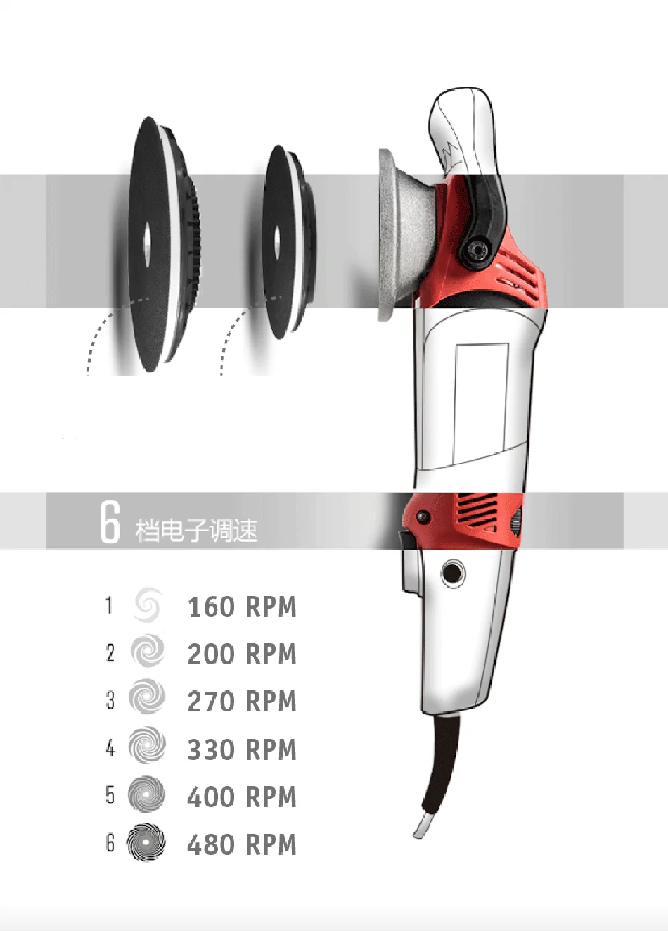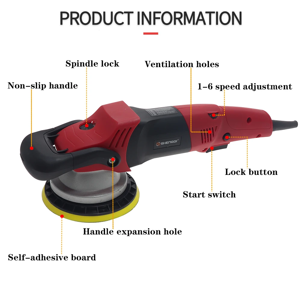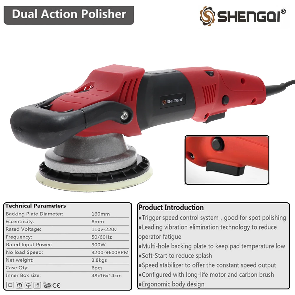 Модель: SQ3601 Напряжение: 110 В/220 В Диаметр диска: 160 мм Номинальная мощность: 900 Вт Эксцентричное вращение без нагрузки: 3200-9600/мин Расстояние смещения: 8 мм Опорная пластина: 5 дюймов/6 дюймов Установка скорости: 6 переменных скоростей Изделие: Машинная полировальная машина двойного действия с принудительным вращением Номер Сертификата 3C: 2017010503990658 Функция: Машинная депиляция, полировка и быстрая отделка [изделие]: принудительное вращение двойного действия полировщик автомобиля