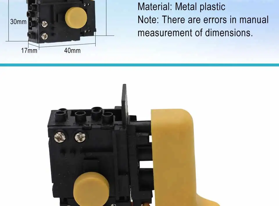 Електричюеского инструмента переключатель Описание: 100% новый и высокого качества. Название продукта: Триггерный переключатель Классификация: ca 250V Материал: металл Пластик Примечание: возможна погрешность в 1-3 мм из-за ручного измерения.