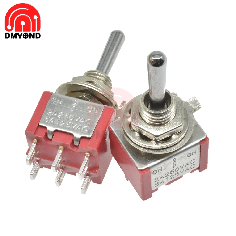MTS-223 тумблер однополюсный двойной бросок SPDT ON-ON 120VAC 5A 1/4 дюймов Монтаж 13*11,6 мм (MTS223) 3 положения 6 контактов125 В/5А красный Посылка включает в себя: 1 х переключатель