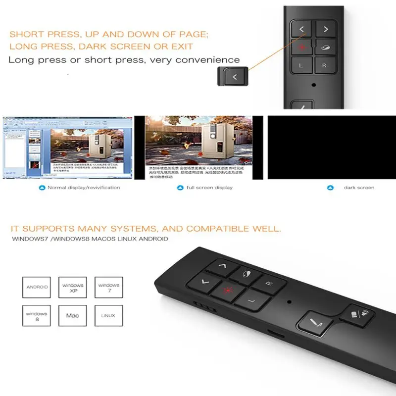 Функция 1,2 в 1 презентационные пульты laserlight pen 2.RF 2,4G технология дистанционного управления, поддержка сверхдлинного беспроводного диапазона 3. С помощью мультимедийных клавиш вы можете гибко управлять им в руке при серфинге в Интернете, просмотре телевизора, прослушивании музыки, воспроизведении игр и т. д. 4. Маленький и тонкий корпус, Легко носить с собой везде с карманным размером 5. Удобный в использовании, подходит для традиционных проекционных экранов, телевизионные дисплеи, светодиодный экран, И смарт-доски Технические Характеристики Название продукта: презентация пультов лазерный Светильник Цвет ручки: черный технология дистанционного управления: RF 2,4G Размер: тонкий размер Функция 1: презентация пультов Функция 2: лазерный светильник ручка Примечание реальный Цвет товара может быть s светильник ly отличаться от изображений, размещенных на веб-сайте, по причине многих факторов, таких как яркость вашего монитора и светильник яркость. Посылка включает в себя презентационные пульты Laserlight Pen (аккумулятор не входит в комплект)