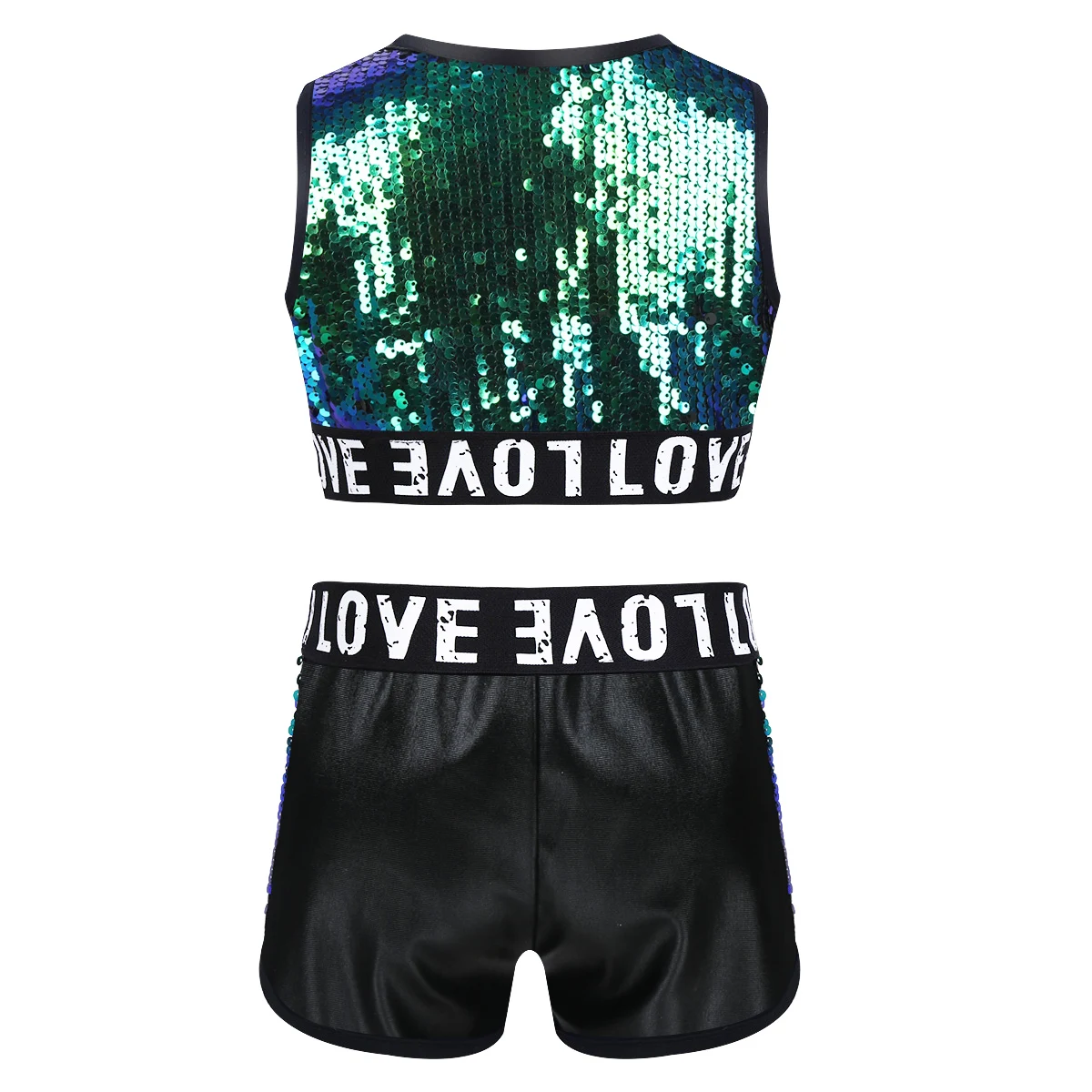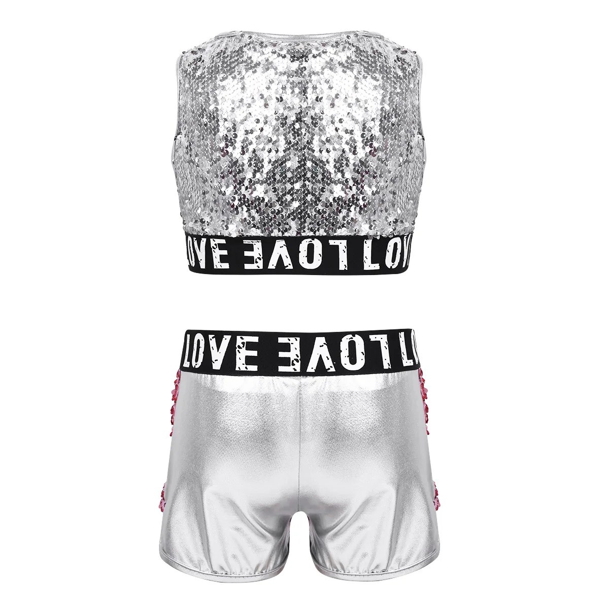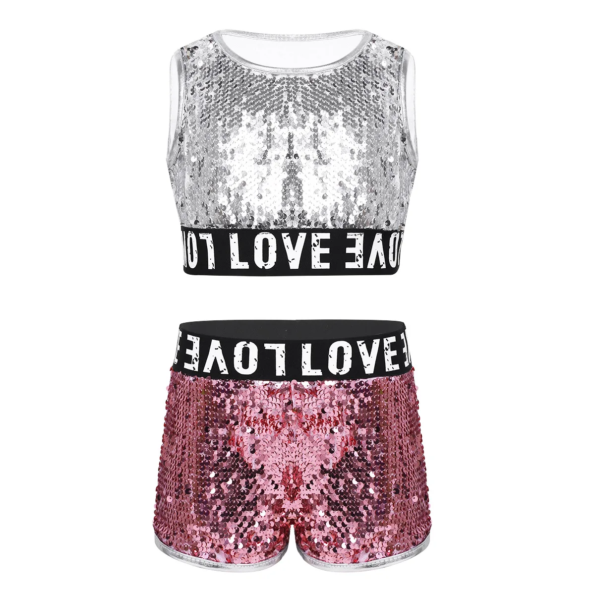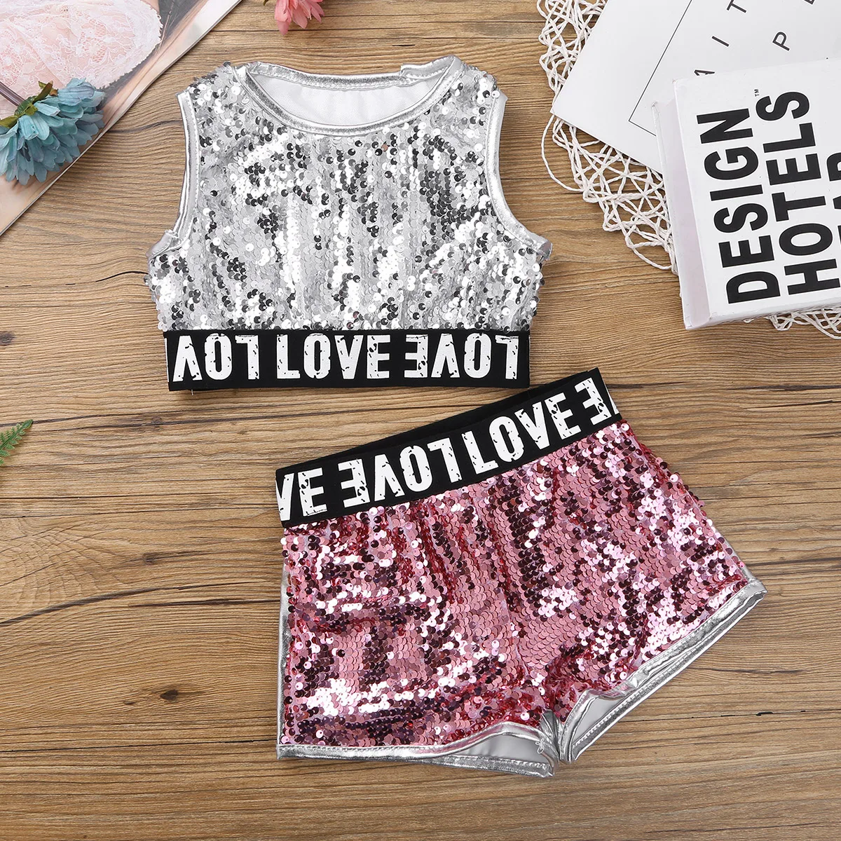 Подходящие шорты с буквенным принтом и эластичным поясом. С подкладкой для комфортного ношения. Шикарный и классный комплект одежды для танцев для ваших девочек.