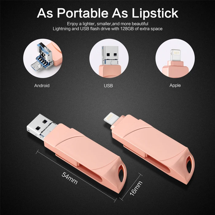 Технические характеристики изделия: Название: CooDisk FLASH DRIVE Емкость: 8 ГБ/16 ГБ/32 ГБ/64 Гб/128 ГБ/256 ГБ Интерфейс: разъем USB/Lightning/micro USB Материал: цинковый сплав Приложение CooDisk и CooDisk Drive: IPhone XS, iPhone XS Max, iPhone XR, iPhone X, iPhone 8, iPhone 8 Plus, iPhone 7, iPhone 7 Plus, iPhone SE, iPhone 6, iPhone 6 Plus, iPhone 5, iPad Air, iPad mini, iPad mini 4, iPad Pro 12,9 ", iPad Pro 9,7" IPad с дисплеем Retina, iPod 5-го поколения и новее, с разъемом Lightning и iOS 8,2 + Поставщики флэш-памяти используют десятичную арифметику: 1 Мб = 1000кб, 1 г = 1000 Мб Рассчитано, операционная система использует бинарную арифметику: 1 Мб = 1024кб, 1 ГБ = 1024 МБ; Таким образом, существуют некоторые различия между емкостью дисплея и номинальной емкостью продукта флэш-памяти О Ёмкость: 8 ГБ = Приблизительно 7,2 ГБ ~ 7,4 Гб; 16 Гб = приблизительно 14 ГБ ~ 14,6 Гб; 32 Гб = приблизительно 28 ГБ ~ 30 Гб; 64 ГБ = приблизительно 58 ГБ ~ 60 Гб; 128 ГБ = Приблизительно 115 ГБ ~ 118 Гб; 256 ГБ = приблизительно 230 ГБ ~ 236 ГБ. Посылка: 1 * MGL OTG флэш-накопитель (оригинальная розничная упаковка) Примечание: Чтобы избежать потери данных или механических повреждений, не подключайте компьютер или не отключайте флэш-диск во время передачи Поддержка Android мобильный телефон (Android файловый менеджер) Инструкции: Загрузите Бесплатный CooDisk из App store для iPhone