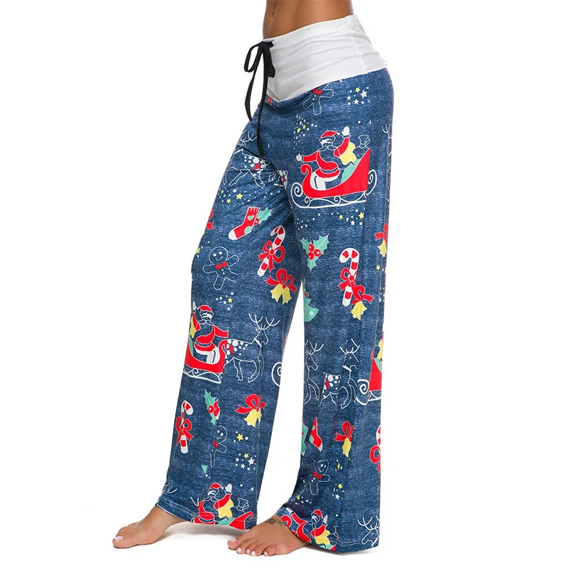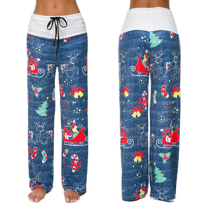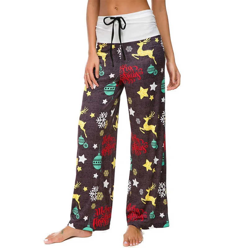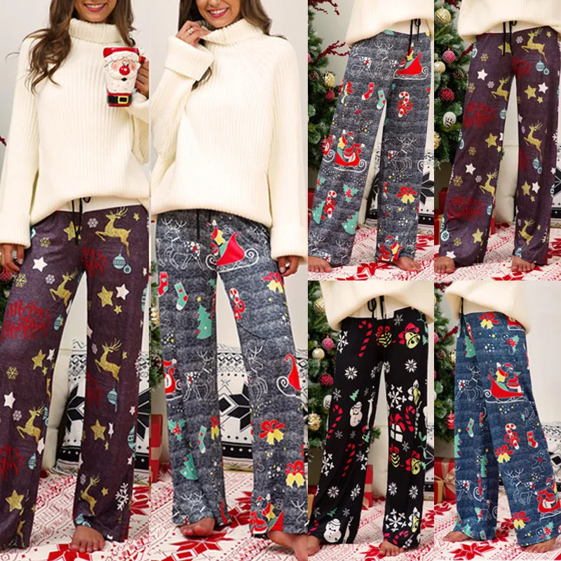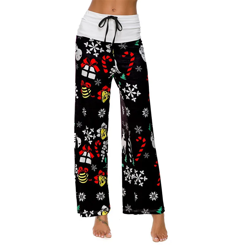 Женские повседневные длинные брюки на завязках с рождественским принтом, широкие брюки с высокой талией