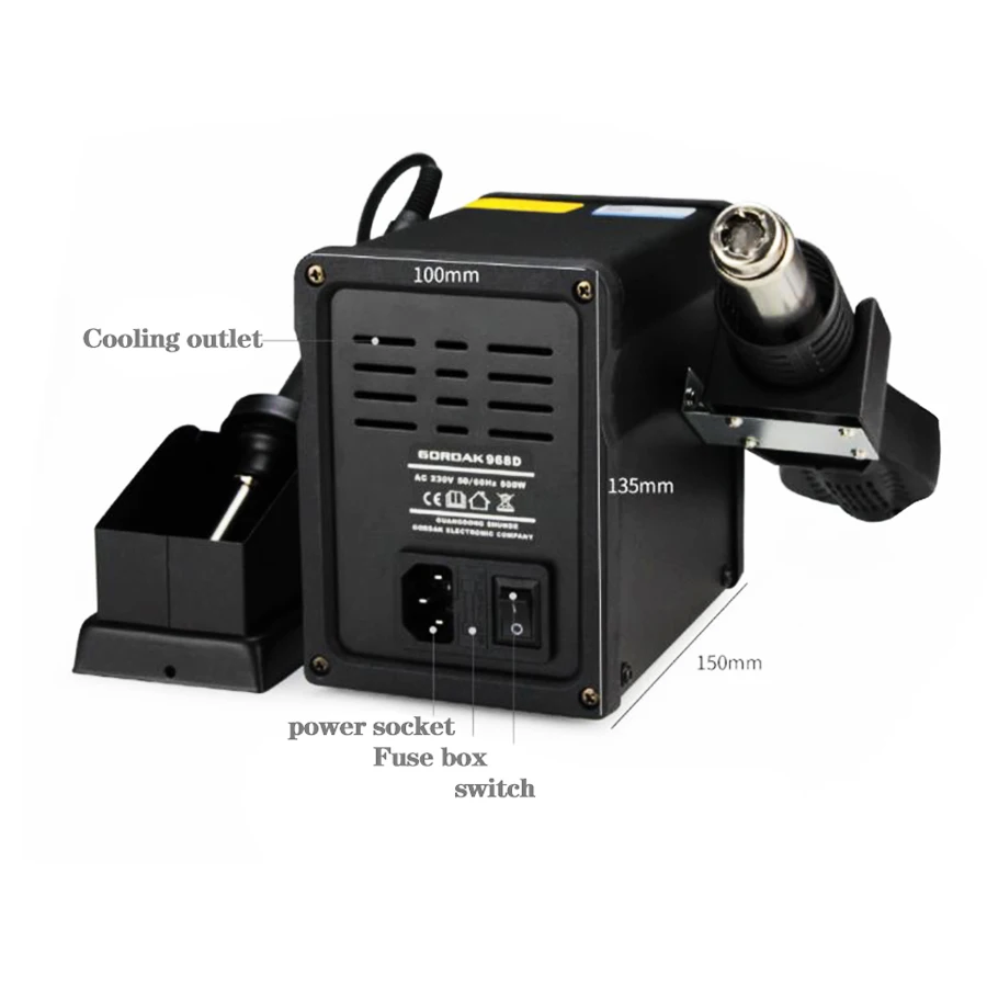 Светодиодный температурный цифровой дисплей, длительный срок службы. Встроенный тепловой пистолет и паяльник. Бесщеточный вентилятор имеет очень долгий срок службы, очень низкий уровень шума и мягкий ветер для защиты чипа! Кроме того, система имеет автоматическую функцию холодного воздуха, которая автоматически входит в энергосберегающее состояние при охлаждении до 100 °C! (Режим ожидания: порт воздушного пистолета вверх, вы можете охладить до 100 °C, затем войти в энергосберегающее состояние)