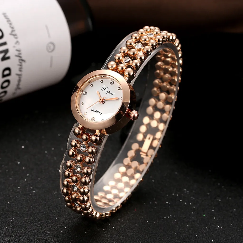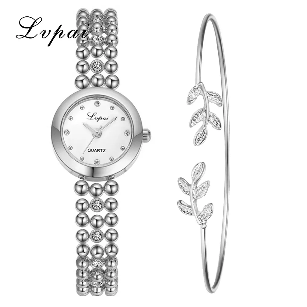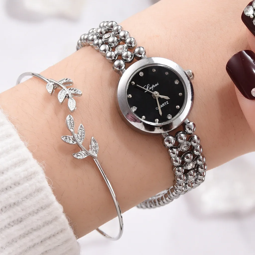 2 шт., женские часы, роскошные модные ювелирные изделия с бриллиантами и бусинами, цепочка, часы, темпераментные листья, браслет, кварцевые часы, набор, mujer L58