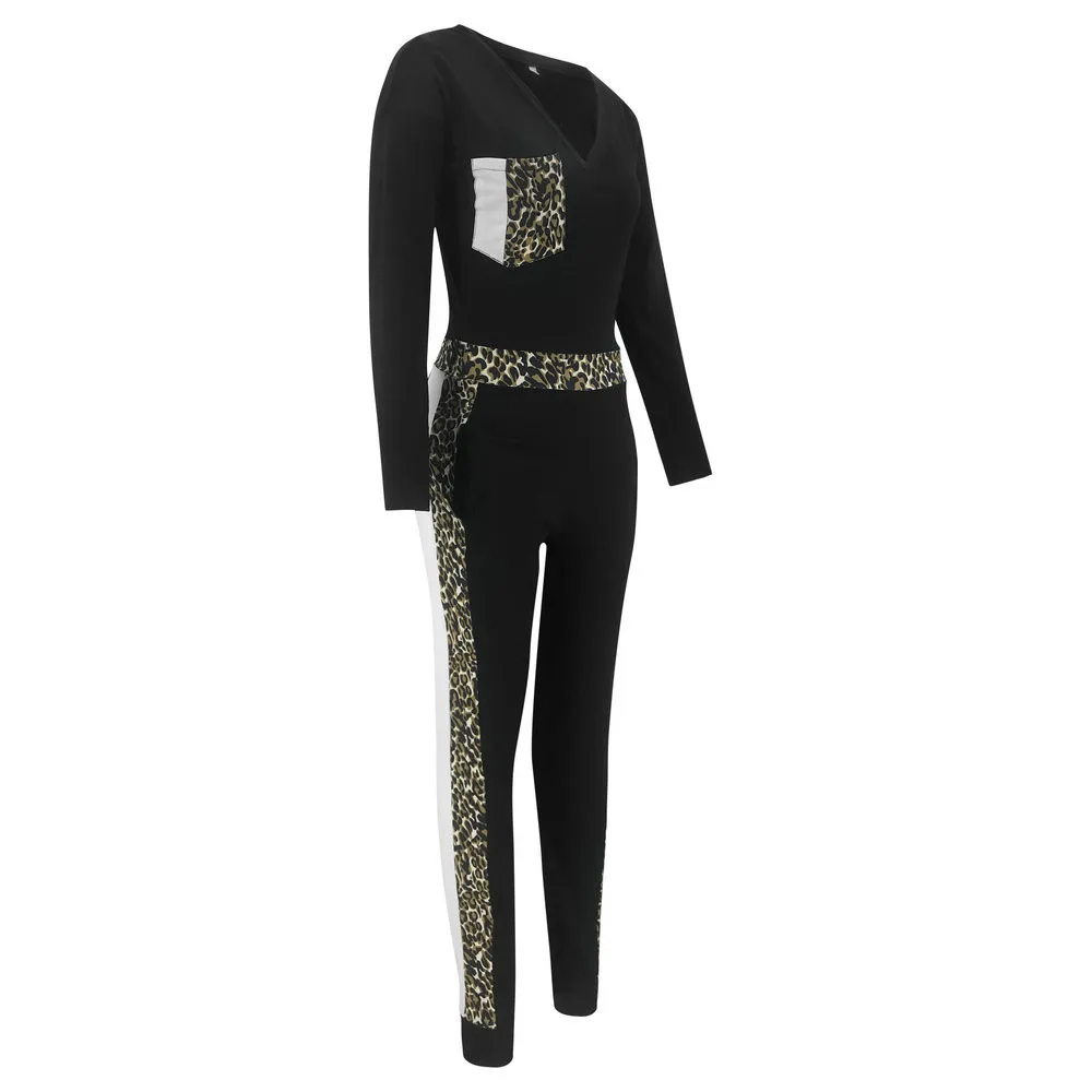 Женский леопардовый принт, v-образный вырез, сексуальный повседневный костюм, толстовка, комплект из двух предметов