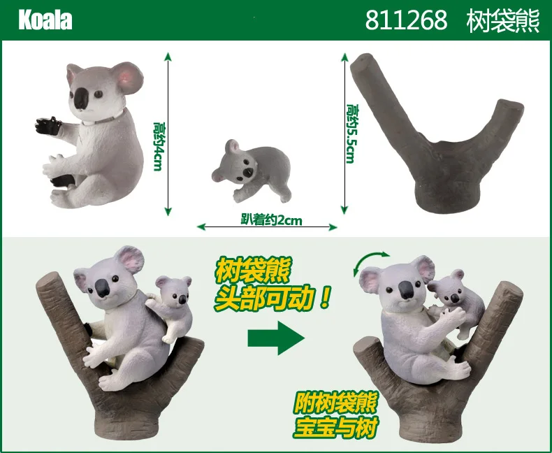 Это забавная и Воспроизводимая фигурка животного, которая позволяет вам знать разнообразие и характеристики животных в трех измерениях. Коалы перемещают шеи. Поставляется с ребенком коала и эвкалиптовым деревом!
