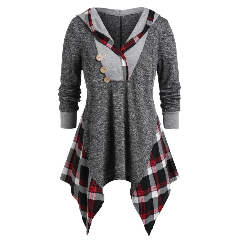 Женская ассиметричная футболка с капюшоном больших размеров, клетчатая футболка с длинным рукавом