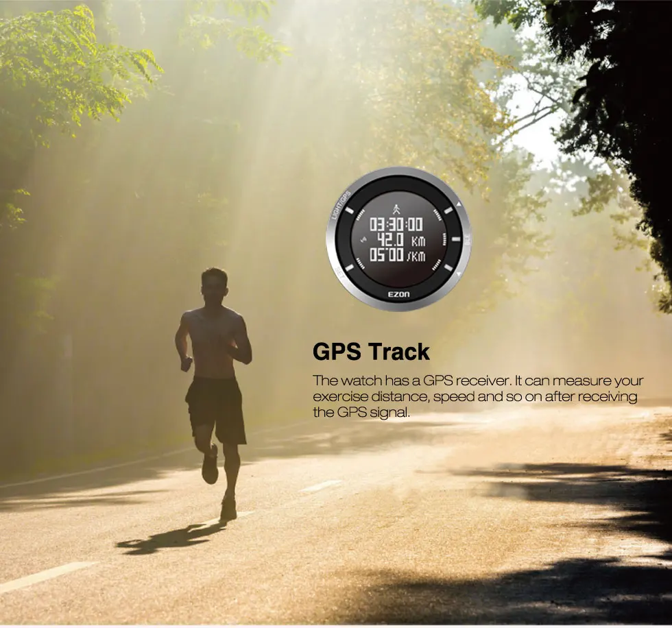 Введение Эти спортивные часы EZON T033A01 для бега предназначены для любителей спорта! Знаете ли вы, сколько шагов вы делаете, сколько калорий вы потребляете и как далеко вы бегаете? Не волнуйтесь, T033 A01 вам ответит. Часы оснащены gps-приемником, пульсометром, барометром, высотометром, термометром и шагомером внутри. Вы также можете просмотреть дорожку упражнений в приложении после завершения упражнений. Чтобы вести здоровую жизнь, покупайте ее для себя, родителей и друзей! Мы рады помочь вам вести веселую и здоровую жизнь. Особенности 1. gps трек Активируйте gps для отслеживания ваших данных упражнений: расположение упражнений, высота, общая продолжительность, общее расстояние, текущее время, текущий темп, текущая скорость, текущие шаги и т. Д. 2. Подключение по Bluetooth 4,0 Совместим с iOS и Android устройствами с Bluetooth 4,0, может передавать данные упражнений в приложение на телефоне, и поделиться ими с друзьями. 3. Динамический монитор сердечного ритма в реальном времени Вы можете знать свой пульс в любое время, лучше следить за своим здоровьем. 4. Шагомер Измеряйте свои ежедневные шаги и автоматически сбрасывайте их в полночь каждый день, осваивайте состояние выполнения упражнений. 5. Интеллигентая (ый) напоминание Спортивные напоминания, напоминания о звонках, напоминания о сидячем положении и напоминания о тревоге, четыре типа напоминаний напоминают вам каждый важный момент в жизни или во время упражнений. 6. Водонепроницаемость 5 атм Без проблем носить его во время мытья рук, душа или плавания, но не подходит для дайвинга или сауны. (Пожалуйста, не нажимайте кнопки под водой) 7. Подсветка Дисплей Освещает около 5 секунд, легко читается ночью. 8. Календарь Дисплей Автоматическая Дата, не нужно проверять мобильный телефон. 9. Прочная конструкция Высокопрочное закаленное стекло, кнопка и чехол из нержавеющей стали, Классическая пряжка, Резиновая лента, задняя крышка с USB зарядным интерфейсом и логотипом. 10. Батарея зарядки Перезаряжаемый полимерный аккумулятор, занимает 2-3 часа для полной зарядки часов. 11. Рабочее расстояние Bluetooth Эффективное рабочее расстояние Bluetooth составляет около 3-10 метров, очень удобно в использовании. Параметры 1. Бренд: EZON 2. Номер товара: T033 3. Циферблат: Цифровой 4. Тип батареи: перезаряжаемый полимерный аккумулятор 5. Время работы от аккумулятора с выключенным gps: около 2 месяцев 6. Время работы батареи с gps: около 24 часов 7. Диаметр циферблата: 50 мм 8. Чехол Толщина: 18 мм 9. Размер ремешка: 24 мм x 240 мм 10. Глубина водонепроницаемости: 50 м 11. Посылка в комплект входит: 1 x EZON T033 часы, 1 х монитор сердечного ритма ремень, 1 х usb-кабель зарядный зажим Скачать приложение Для Android: http://www.ezonmall.com/ezon_sport_android/en_ezonsport.apk Для Ios: http://en.ezon.cn/ezonsport/ios