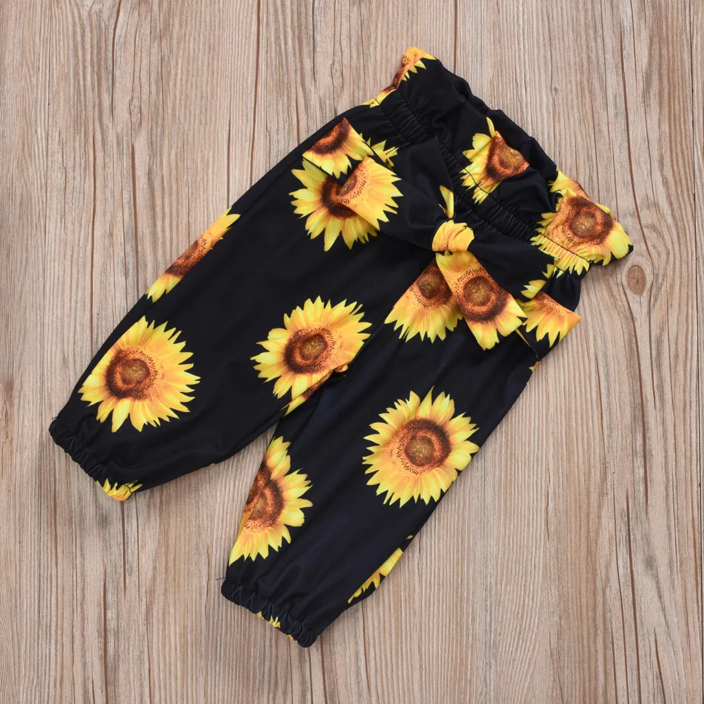 Комбинезон для новорожденных и маленьких девочек, топы, штаны с цветочным принтом и подсолнухами, комплект одежды с повязкой на голову