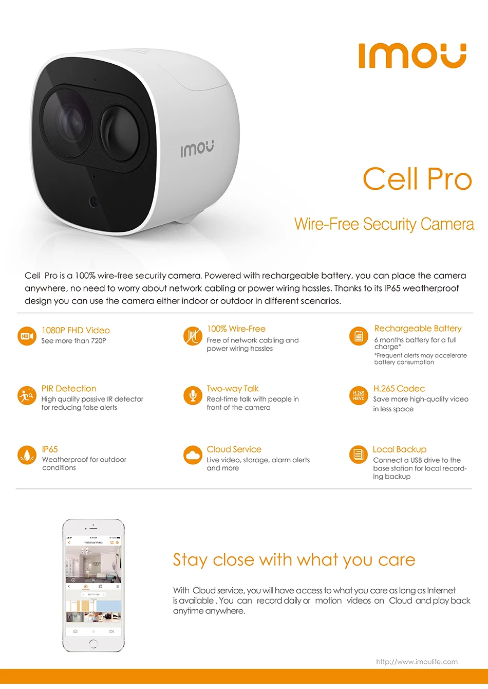Питание от аккумулятора и подключение по Wi-Fi, Cell Pro можно разместить в любом месте. IP65 всепогодный дизайн позволяет легко следить за вашим домом, внутри или снаружи, дождь или блеск.