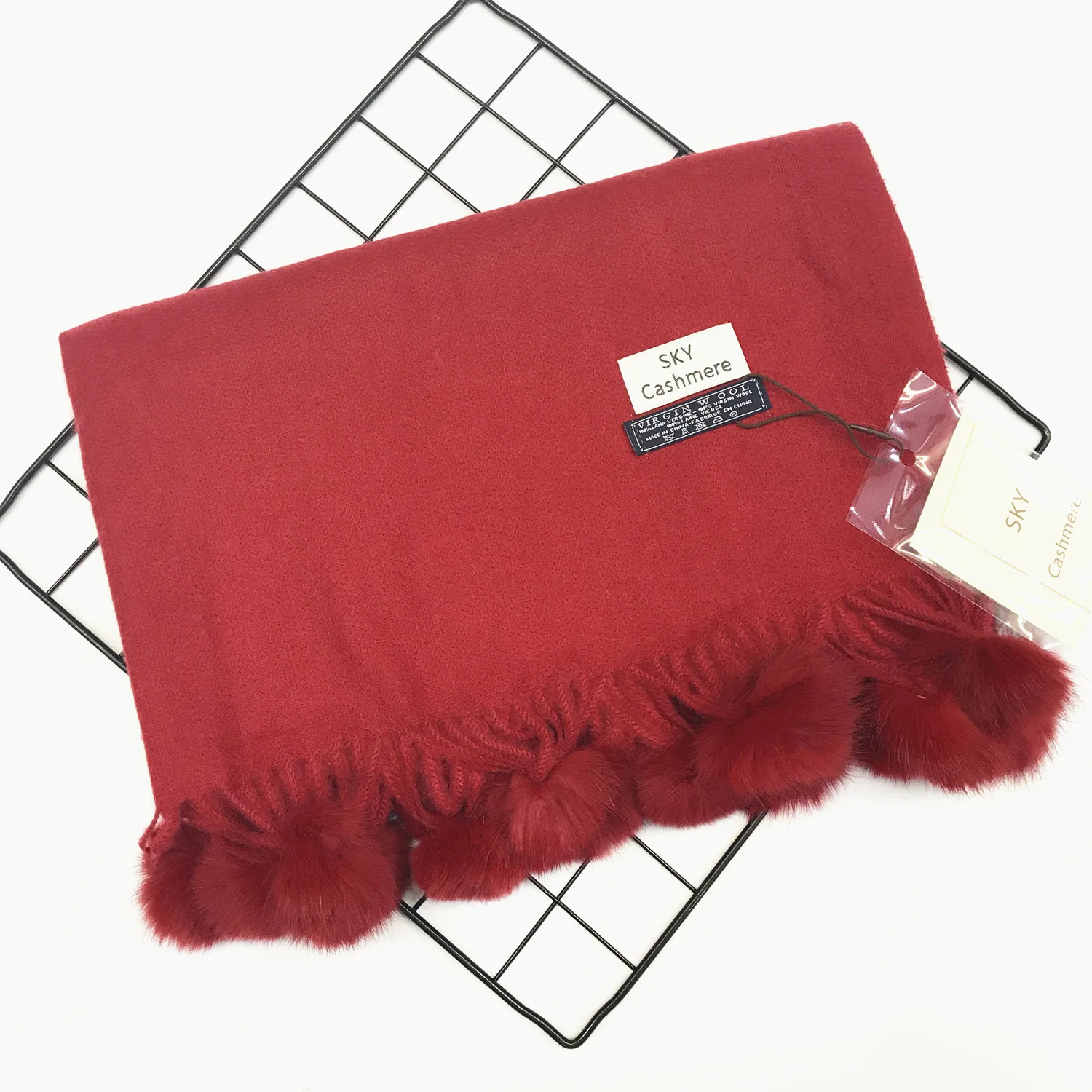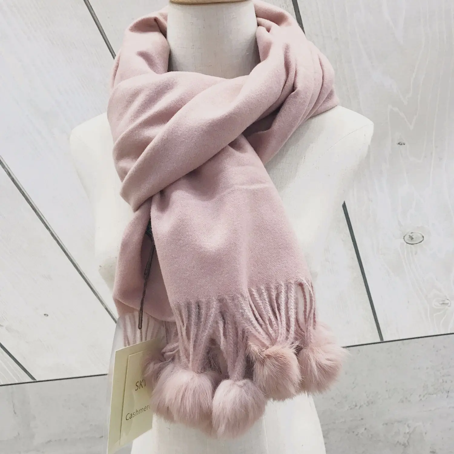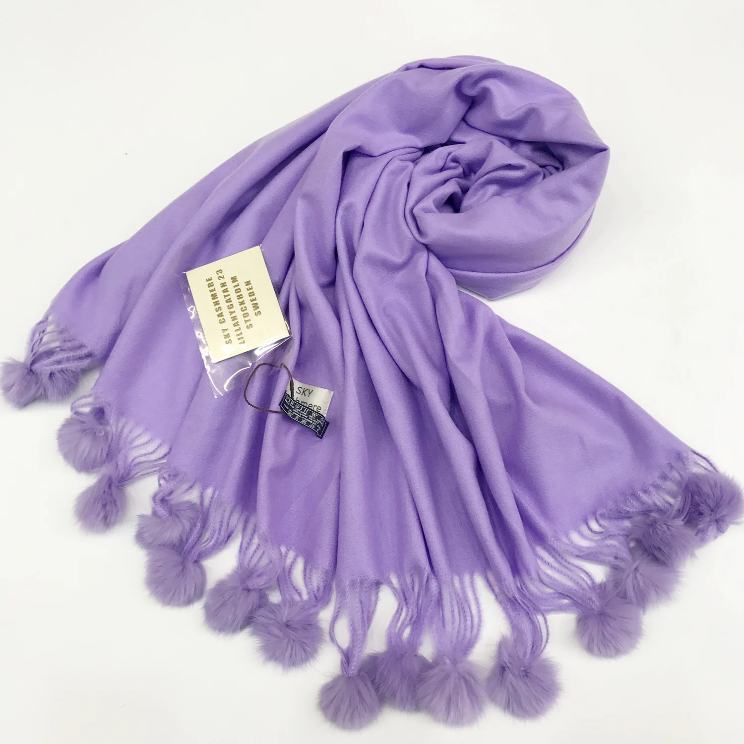 Зимний женский однотонный кашемировый шарф с помпоном из кроличьего меха