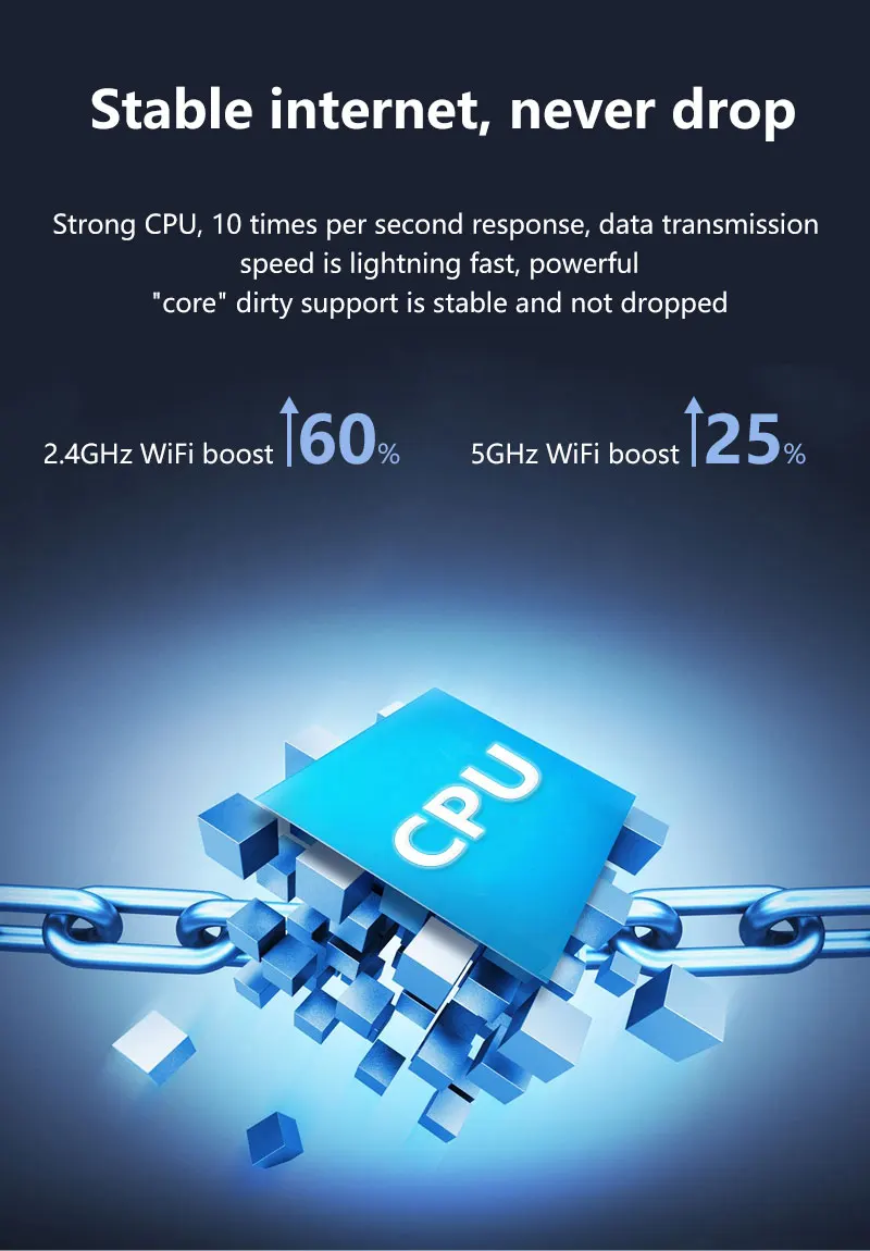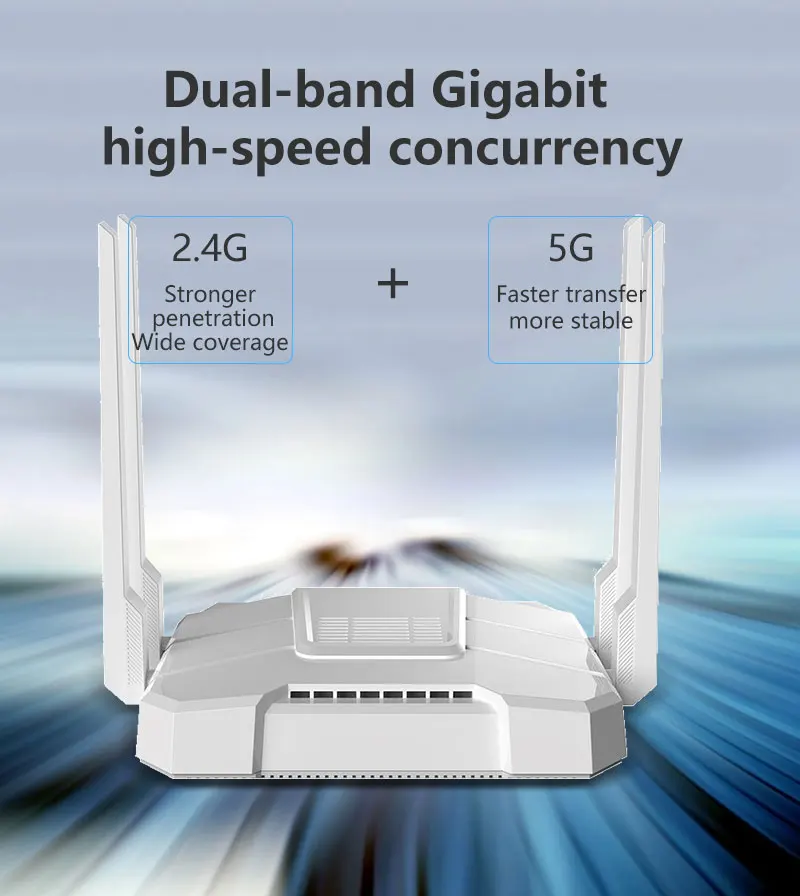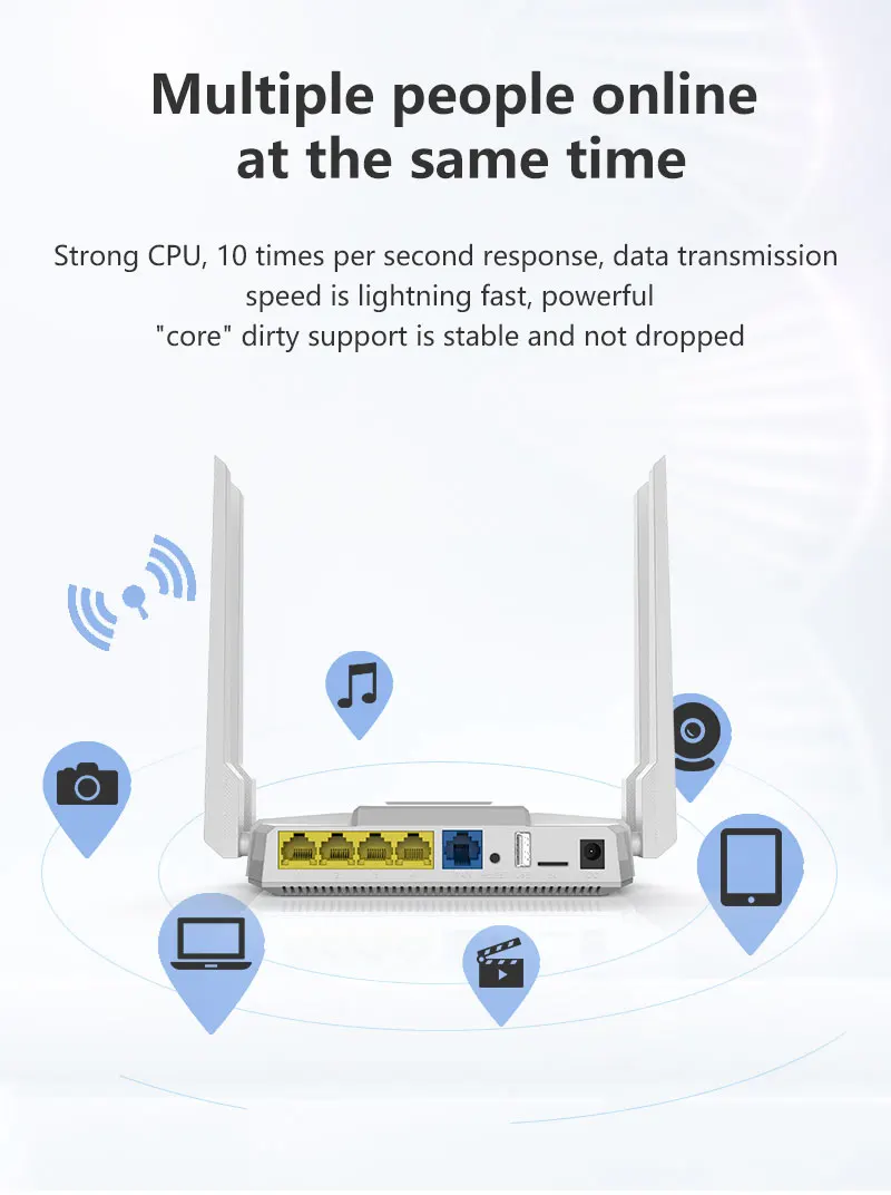 Поддержка сетевого протокола IEEE802.11ac/n/g/b/a, используется 2x2 MIMO (несколько входов и несколько выходов), скорость беспроводной передачи может быть до 1200 м, 4 внешних антенны. Охват Wi-Fi может быть 50 метров, может поддерживать клиентов s 30 онлайн.