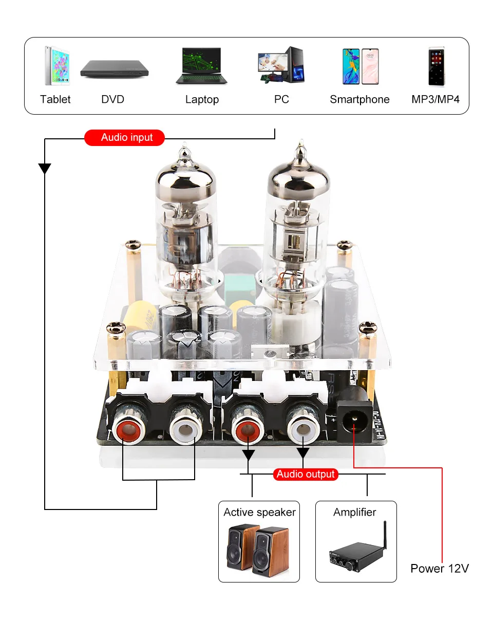 Это электронная плата предварительного усилителя без функции усилителя. Источник питания DC12V (DC12/1A), не может быть подключен к усилителю наушников и динамикам, не может быть подключен к источнику питания автомобиля
