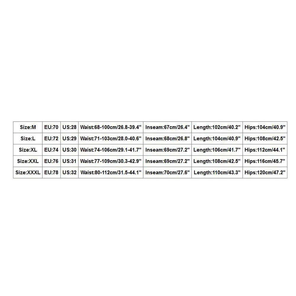 Размер: M EU:70 US:28 талия: 68-100 см/26,8-39,4 "Внутренний шов: 67 см/26,4" Длина: 102 см/40,2 "Бедра: 104 см/40,9" Размер: L EU:72 US:29 талия: 71-103 см/28,0-40,6 "Внутренний шов: 68 см/26,8" Длина: 104 см/40,9 "Бедра: 108 см/42,5" Размер: XL EU:74 US:30 талия: 74-106 см/29,1-41,7 "Внутренний шов: 69 см/27,2" Длина: 106 см/41,7 "Бедра: 112 см/44,1" Размер: XXL EU:76 US:31 талия: 77-109 см/30,3-42,9 дюйма внутренний шов: 69 см/27,2 дюйма Длина: 108 см/42,5 дюйма бедра: 116 см/45,7" Размер: 3XL EU:78 US:32 талия: 80-112 см/31,5-44,1 "Внутренний шов: 70 см/27,6" длина: 110 см/43,3 "Бедра: 120 см/47,2"