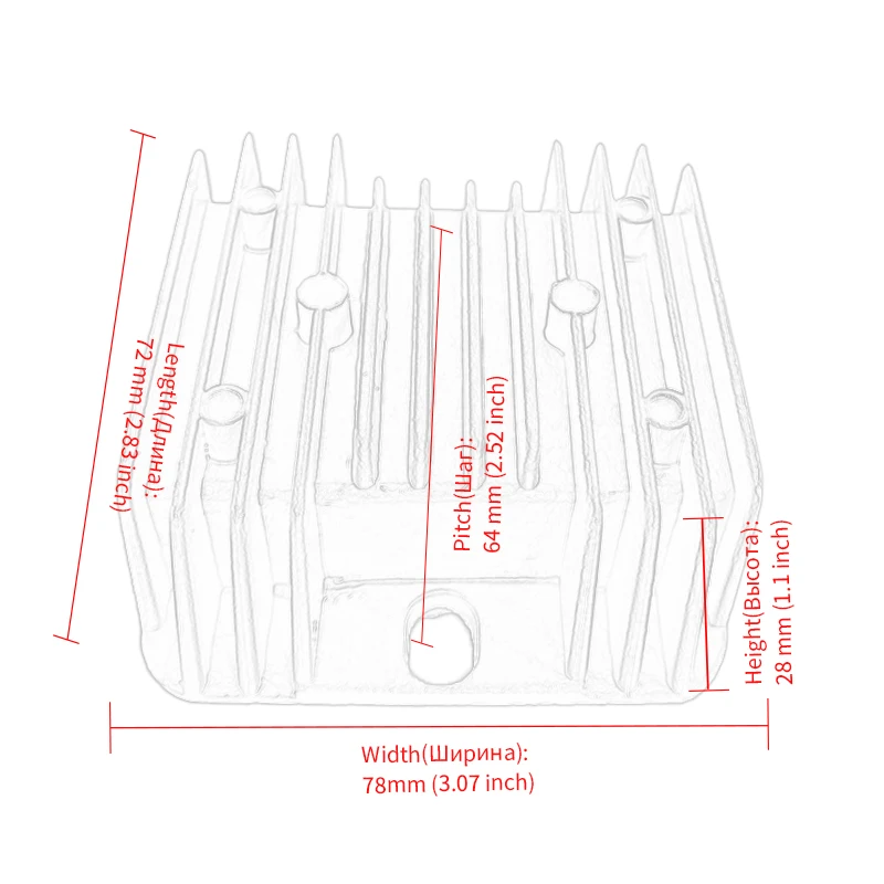 -Выпрямитель для мотоцикла -Входное напряжение: 12 В постоянного тока -Цвет: как на фото -Размеры: 72*78*28 мм (2,83*3,07*1,1/дюйм) -Шаг: 64 мм (2,52 дюйма) Предотвращает перезарядку аккумулятора и повышает Возможность зарядки С ребрами радиатора для лучшего охлаждения Запчасти и аксессуары мотоцикла Регулятор напряжения выпрямителя Сверхпрочная металлическая конструкция Помогает рассеивать излишки напряжения, предохраняет от перезарядки аккумулятора Эффективно улучшает возможности зарядки Большой теплоотвод, ребра, дизайн для максимальной теплоизоляции
