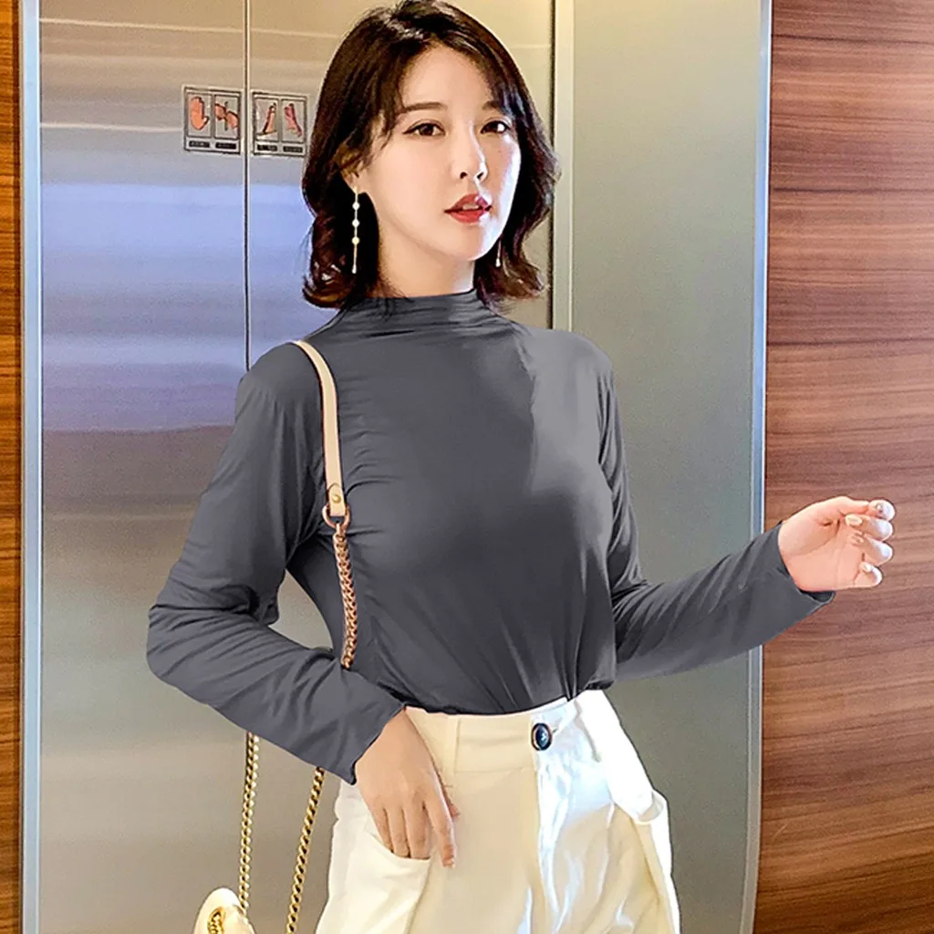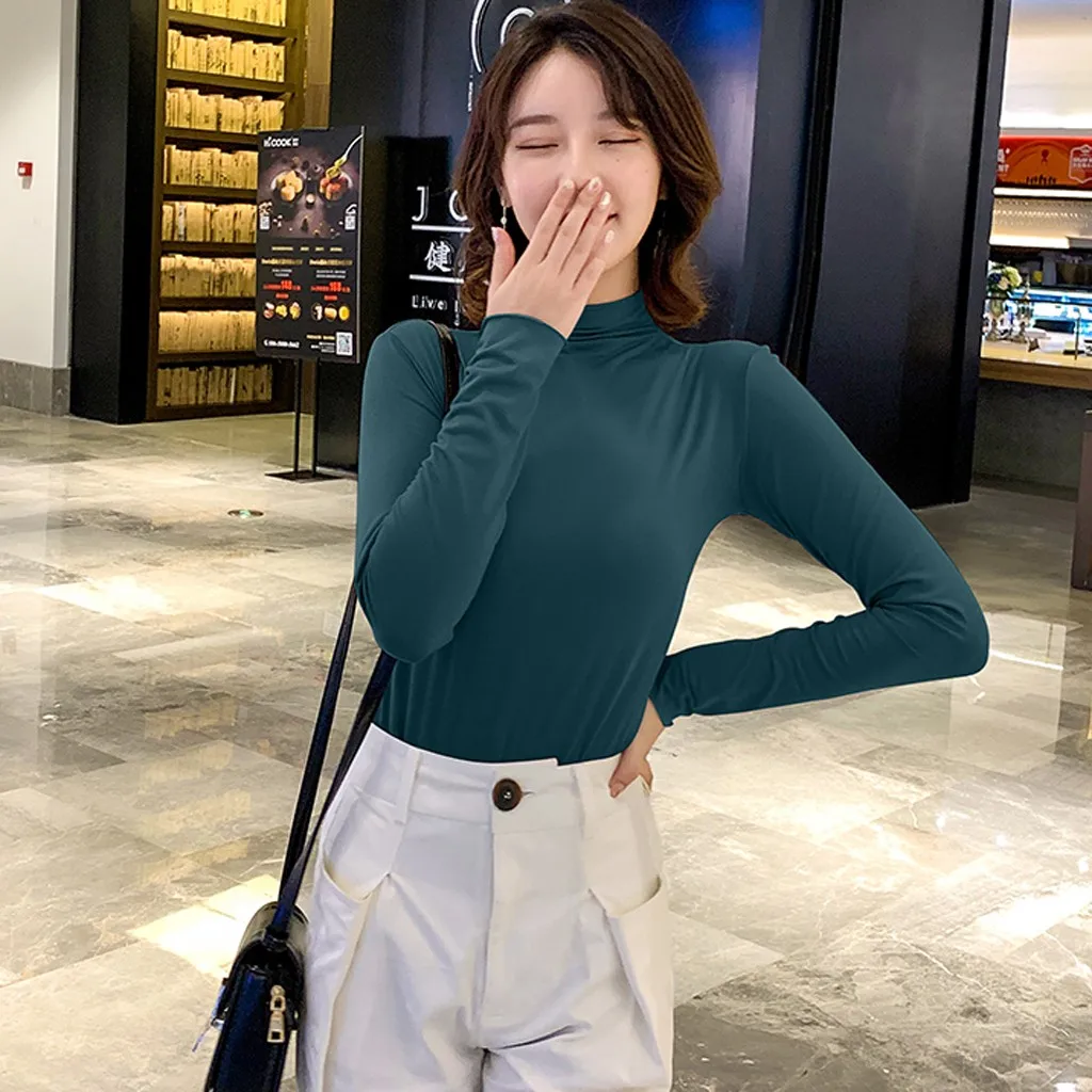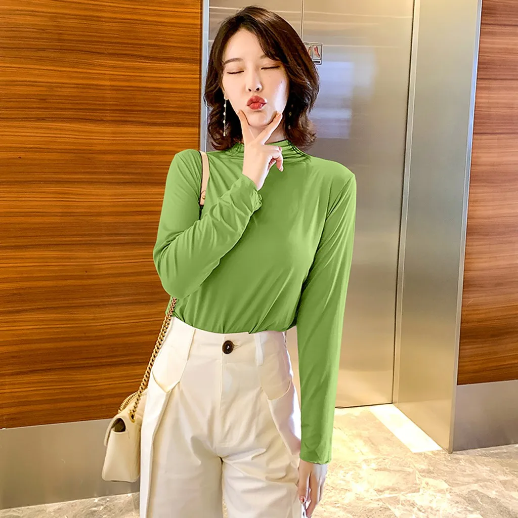 Модный женский топ с высоким воротником, чистый цвет, элегантная повседневная блузка с длинным рукавом