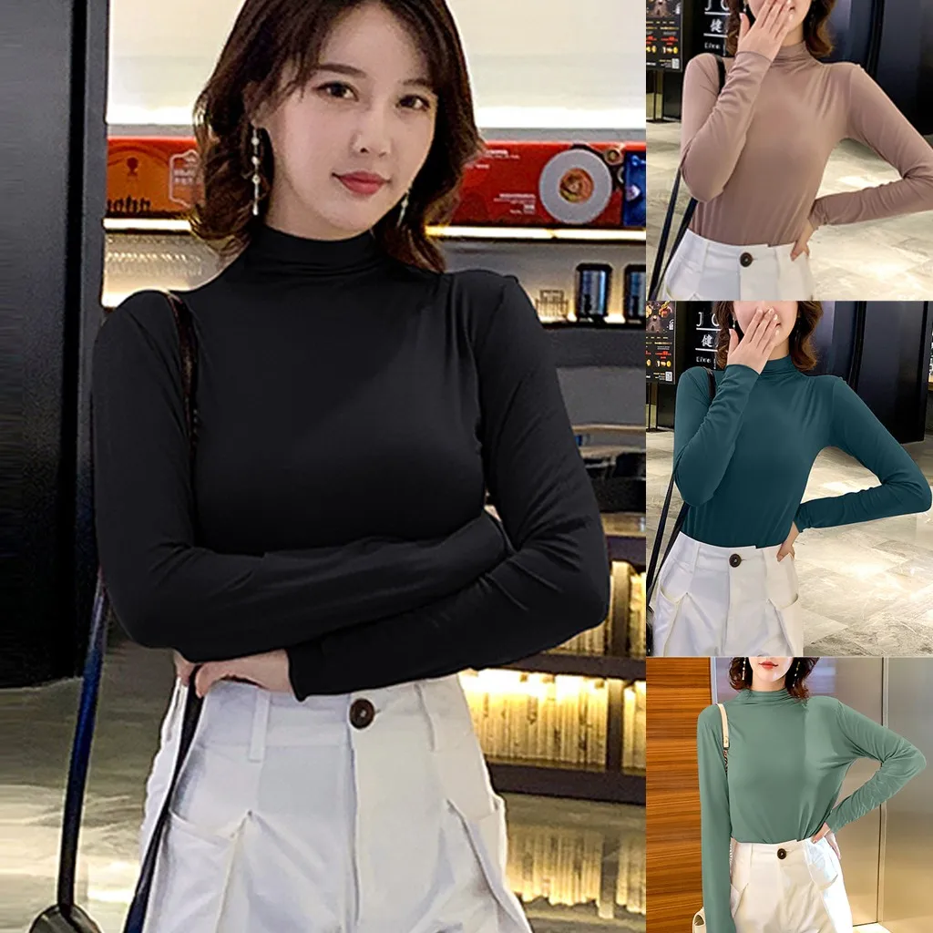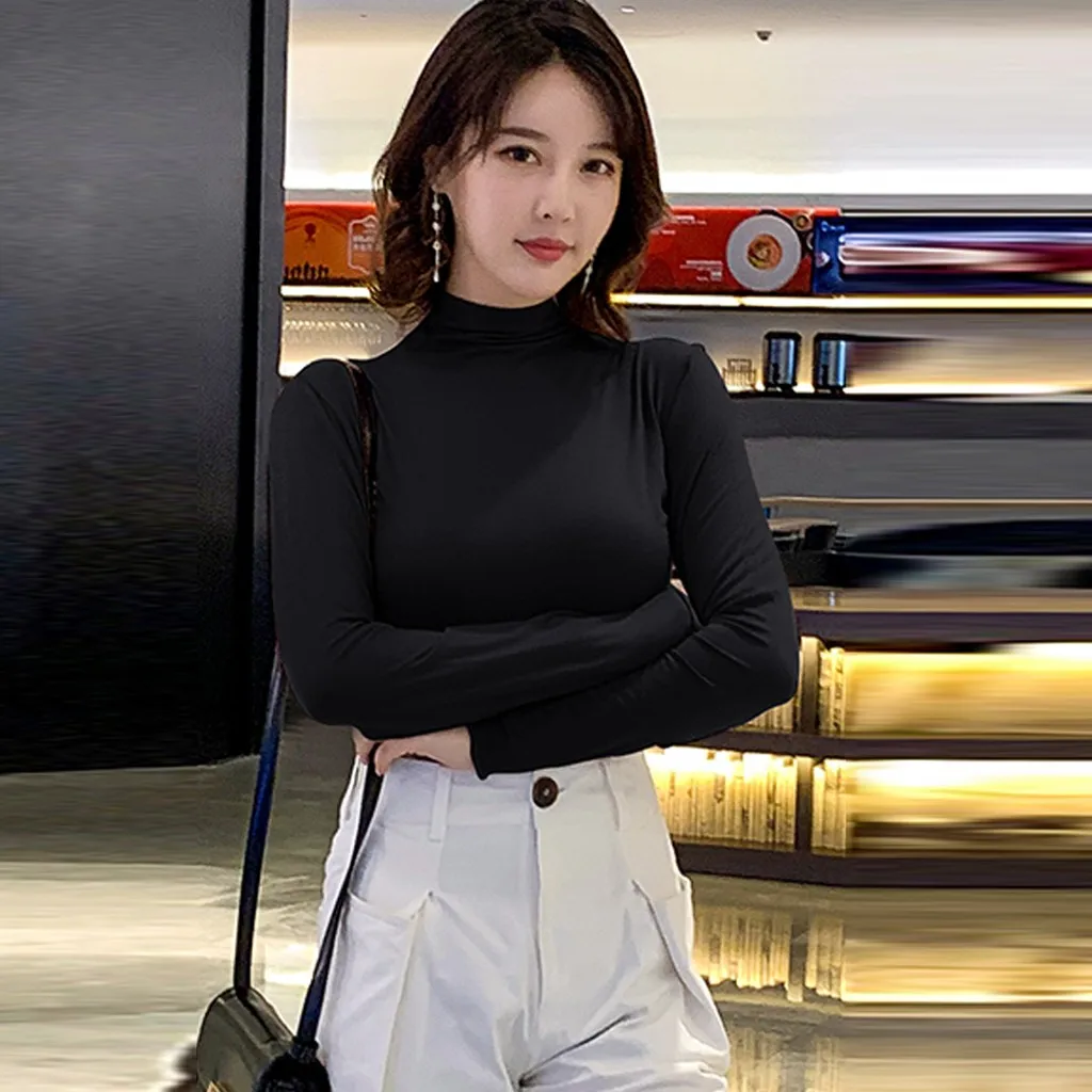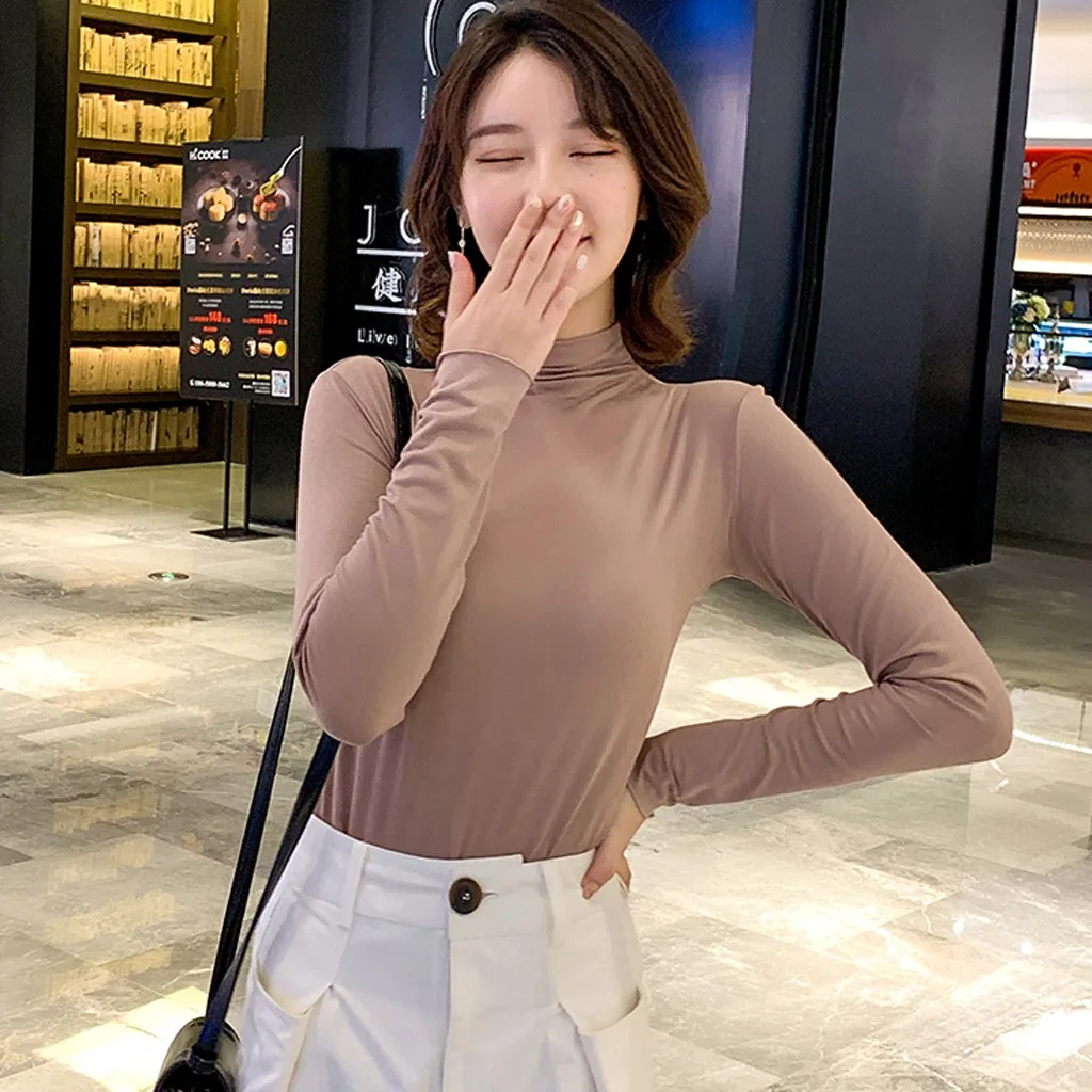 Модный женский топ с высоким воротником, чистый цвет, элегантная повседневная блузка с длинным рукавом
