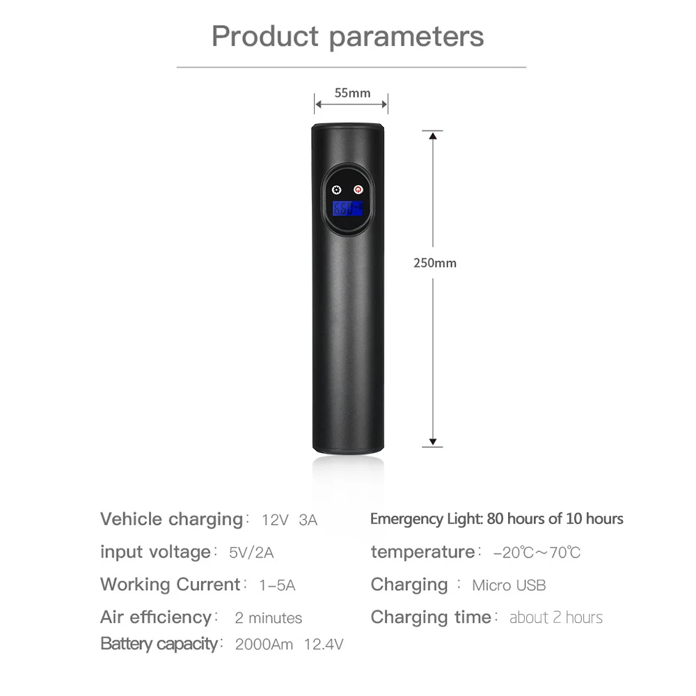 Легко хранить и носить с собой с компактным размером и может использоваться в любом месте, чтобы надуть автомобильные шины в случае чрезвычайной ситуации (если аккумулятор полный).