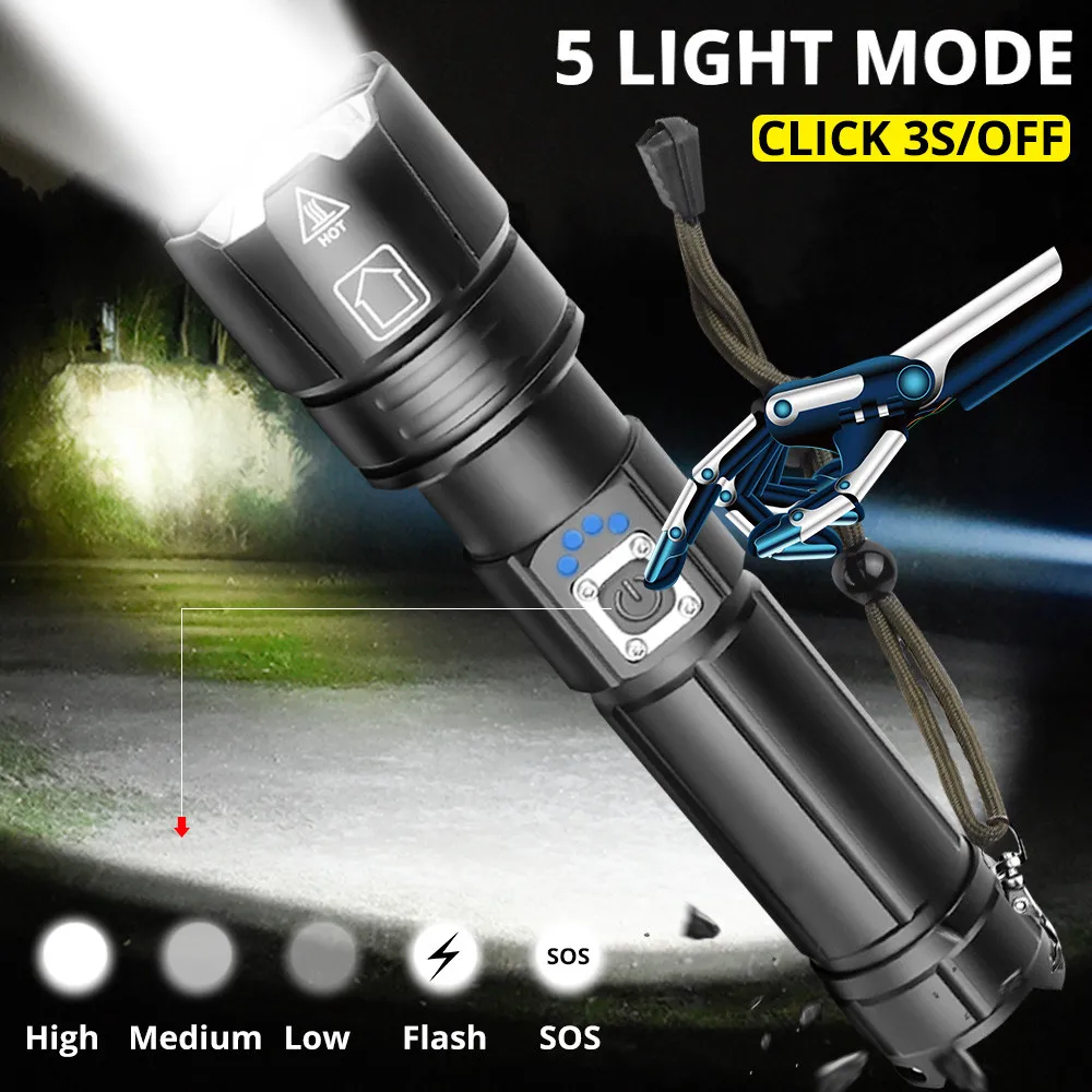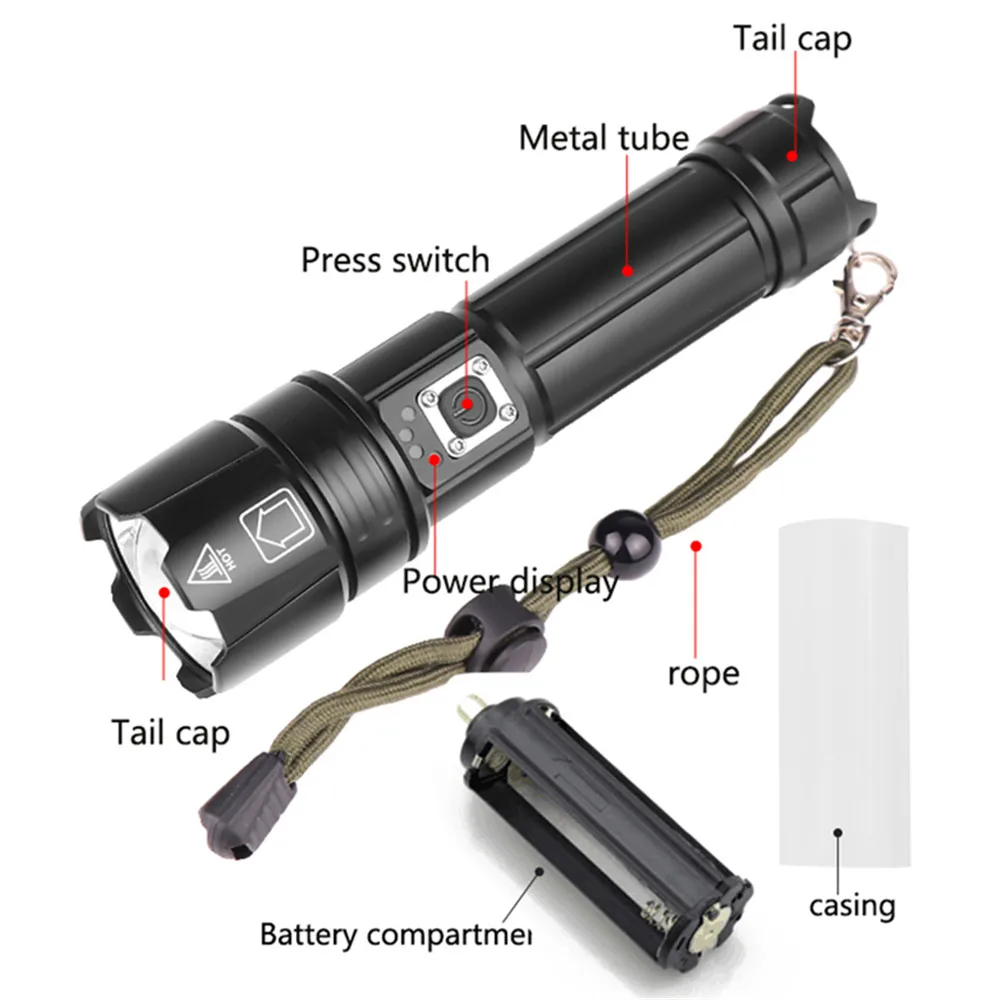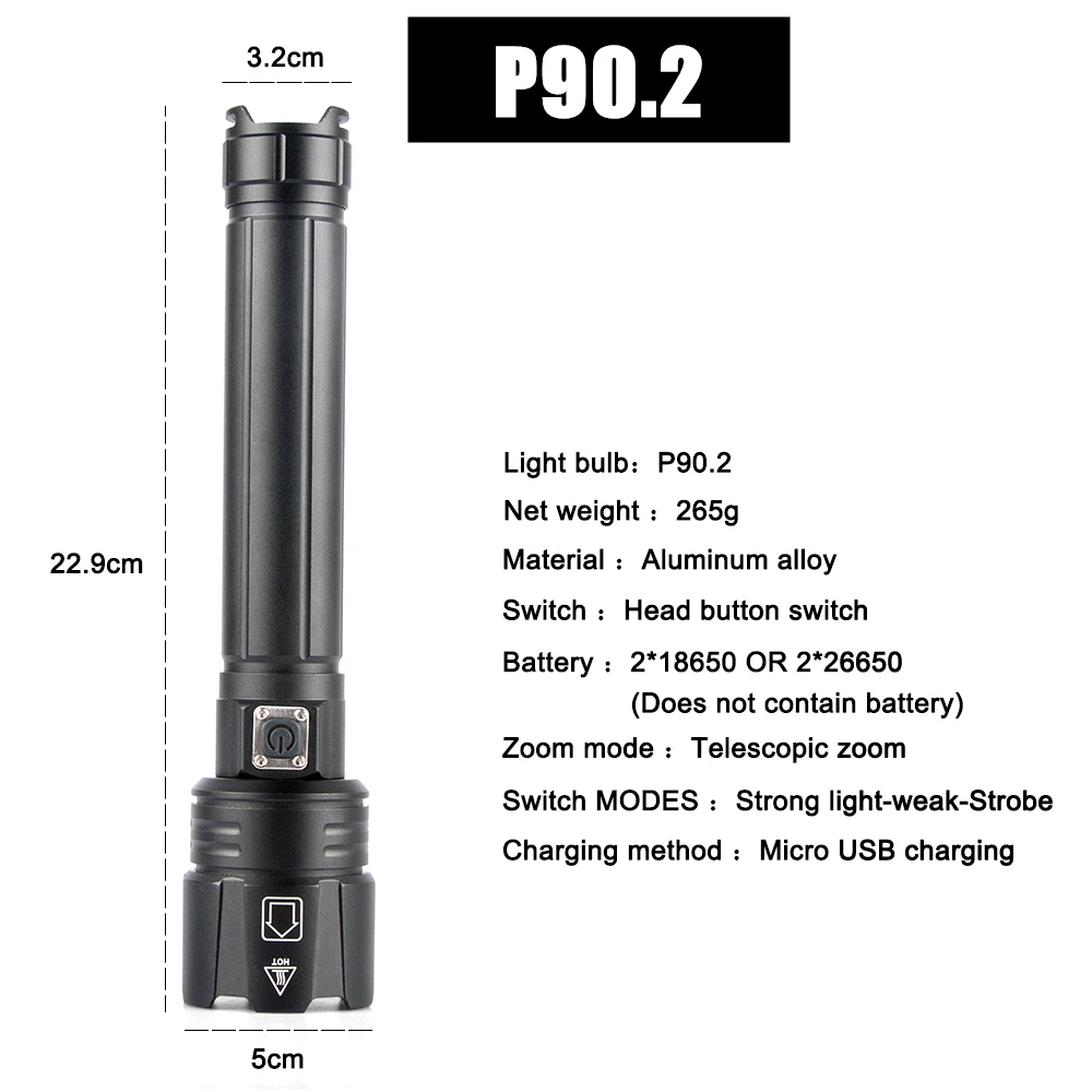 Мощный светодиодный фонарик XLamp XHP90 светодиодный ярче, чем xhp70. Питание от 2*18650 или 2*26650 аккумуляторной батареи, чтобы сделать время работы дольше. Батарея емкость дисплея. Телескопическое изменение масштаба изображения. Микро-usb для компьютера usb, Автомобильный USB, usb-разъем для зарядки, зарядный фонарик. Изготовлен из авиационного алюминиевого сплава прочный HAIII военный класс Жесткий анодированный. Водонепроницаемый в соответствии с IPX-6, водостойкий, может использоваться в дождливую погоду, но не может положить его в воду Подходит для работы, охоты, альпинизма, рыбалки, кемпинга и активного отдыха и т. д. Ударопрочный до 2 метров.
