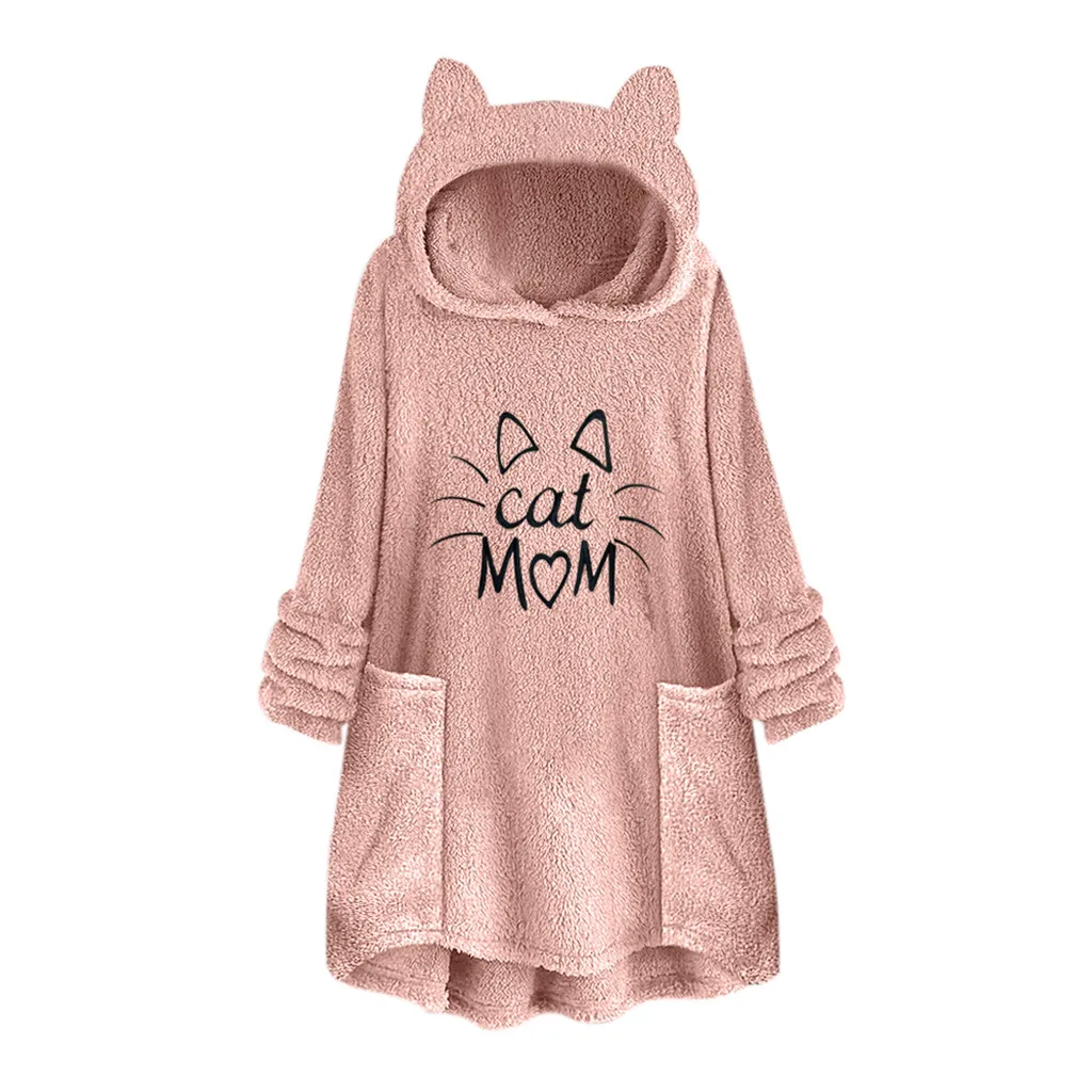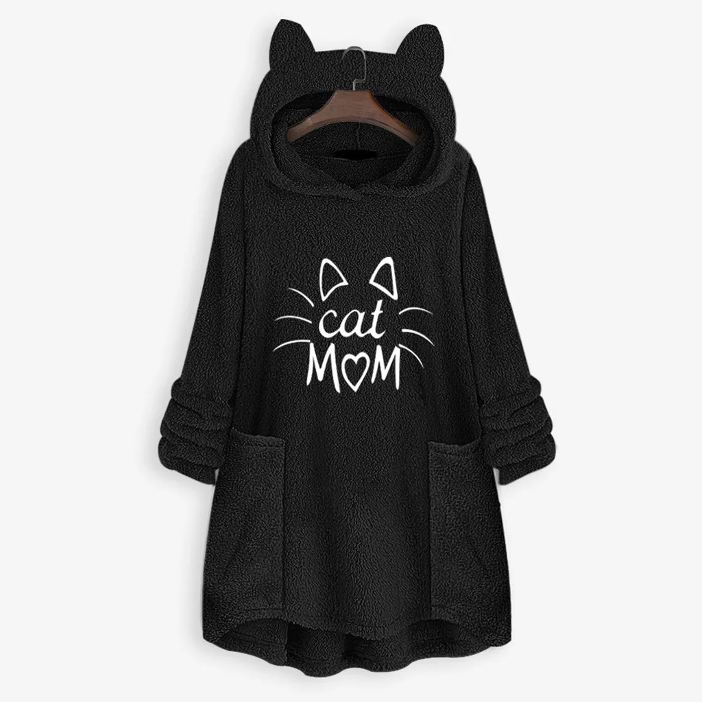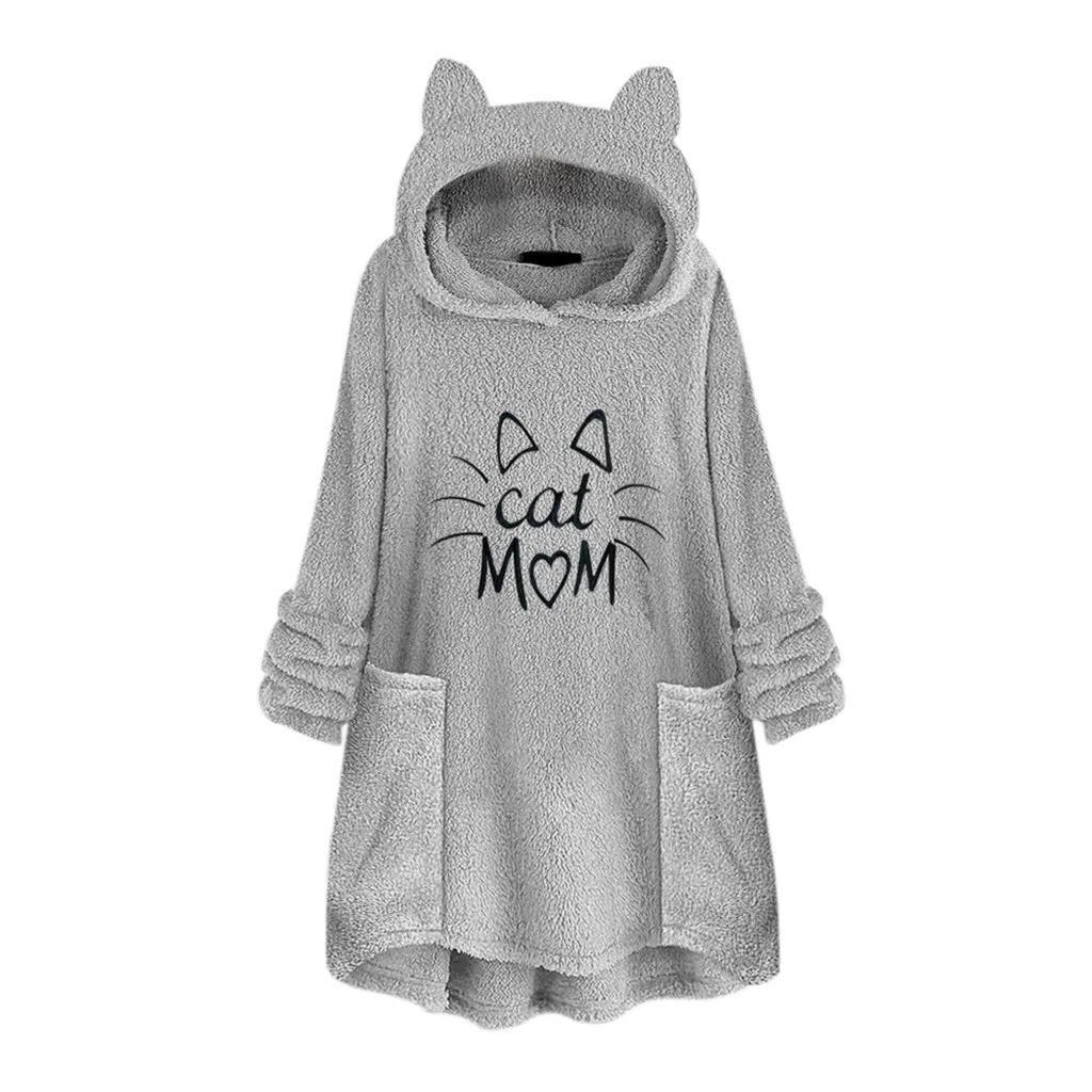 Женский флисовый свитер с вышивкой кошачьими ушками большого размера с капюшоном и карманом