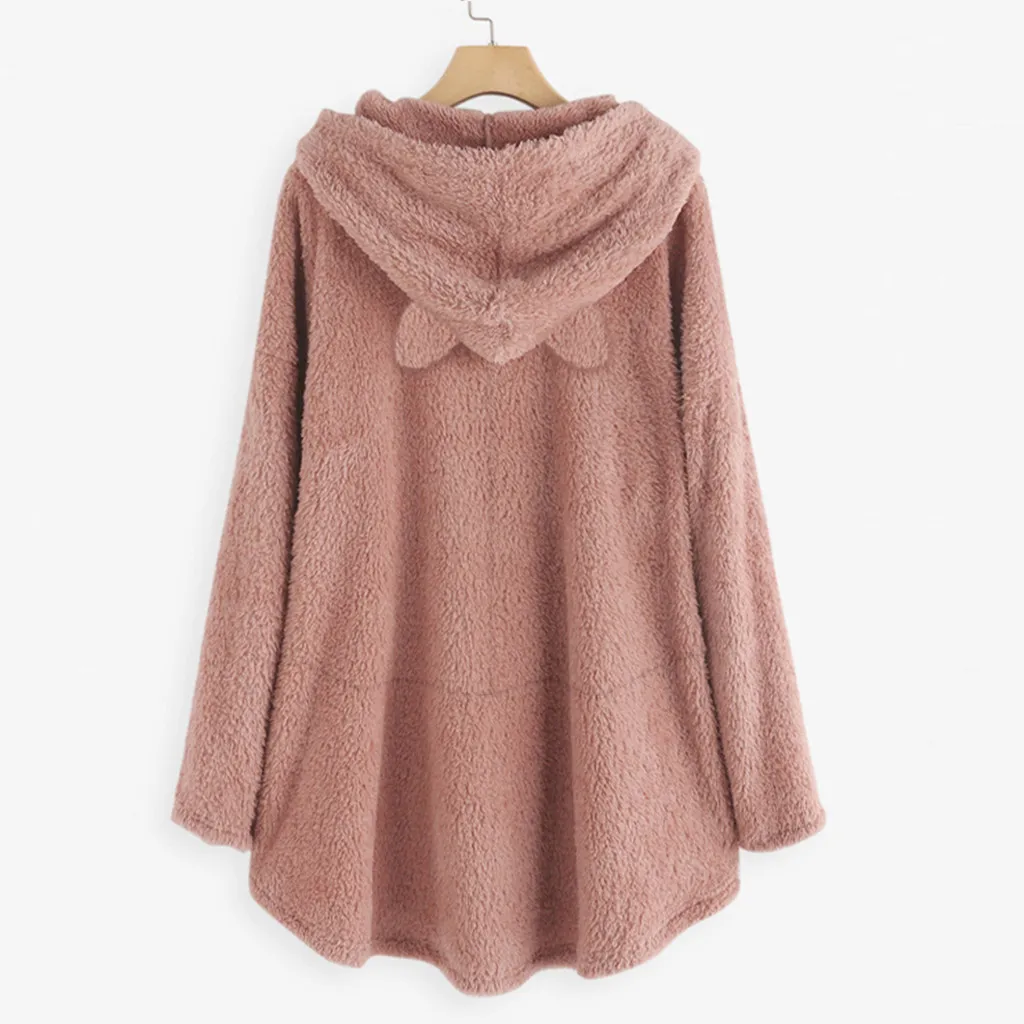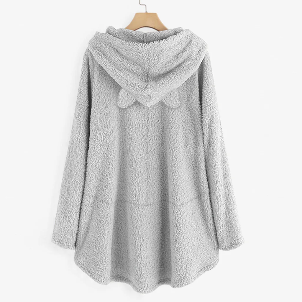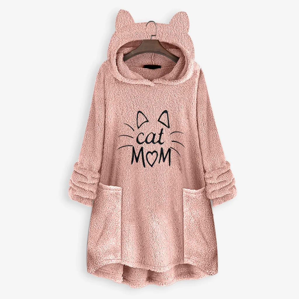 Женский флисовый свитер с вышивкой кошачьими ушками большого размера с капюшоном и карманом