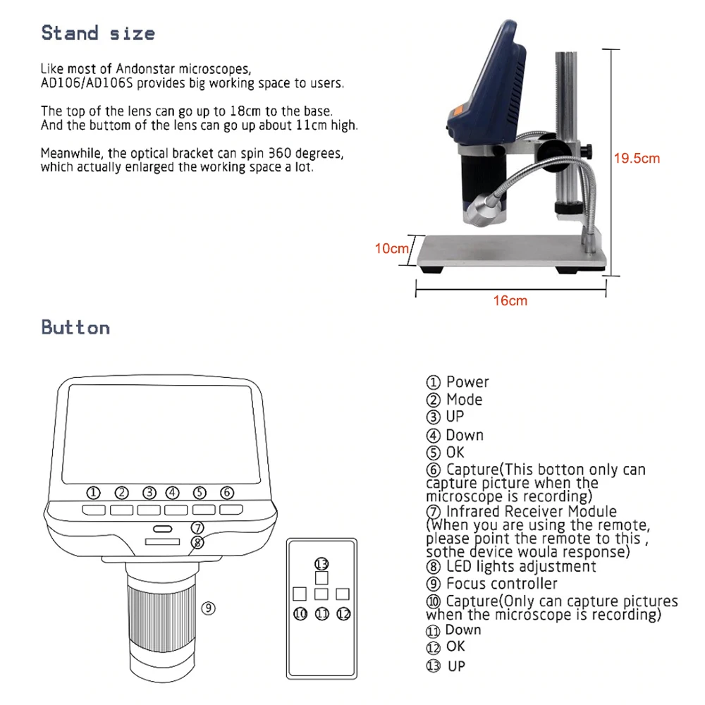 Фокус и светодиодный светильник регулируемый: и фокус, и яркость 8 Светодиодный светильник могут быть отрегулированы ручкой по мере необходимости. (модель AD106S оснащена двумя дополнительное освещение светильник s с обеих сторон)