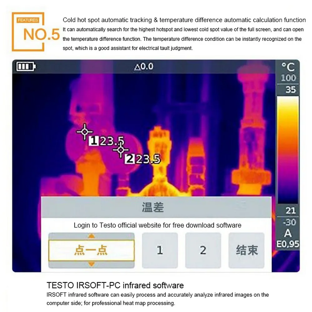 IFOV warner, Testo ɛ-Assist и Testo ScaleAssist помогут вам избежать ошибок в измерениях и легко достичь оптимальной настройки излучательной способности (ɛ) и отраженной температуры (RTC) для построения термографии и цветовых шкал.