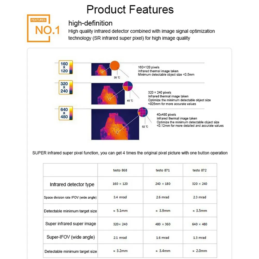 Очень хорошее качество изображения из-за высокого разрешения: 19200 точек измерения температуры для точной термографии инфракрасное разрешение 160x120 пикселей-расширено до 320x240 пикселей с помощью интегрированной технологии супер разрешения визуализируя температурные различия 0,10 ° c тесто Термография приложение позволяет вам чтобы писать отчеты на сайте, сохраните их онлайн и отправьте по электронной почте, А также позволяет использовать мобильные терминальные устройства в качестве второго дисплея или для встроенной цифровой камеры дистанционного управления генерирует реальное изображение параллельно тепловому изображению автоматическое распознавание горячих и холодных точек непосредственно отображает критическое температурные условия Testo ScaleAssist автоматически обеспечивает оптимальную настройку шкалы теплового изображения, что означает, что вы создаете объективно сопоставимые и Безошибочные тепловые изображения, например, тепловая изоляция зданий Testo ɛ-Assist обеспечивает правильный результат измерения путем автоматического определения и настройки излучательной способности и отраженной температуры IFOV warner означает расстояние от объекта измерения/размер пятна замеров определяется, и точка измерения показана на тепловом изображении, поэтому вы Избегайте ошибок в измерениях, потому что камера показывает вам именно то, что вы можете измерить про программное обеспечение для оценки изображения на ПК вы можете выбрать, чтобы сохранить тепловые изображения, как JPEGs Testo type 0560 8681 Testo868 параметры инфракрасный детектор Тип: 160 × 120 Поле зрения (широкий угол): 31 ° × 23 ° пространственное разрешение IFOV (широкий угол): 3,4 mrad