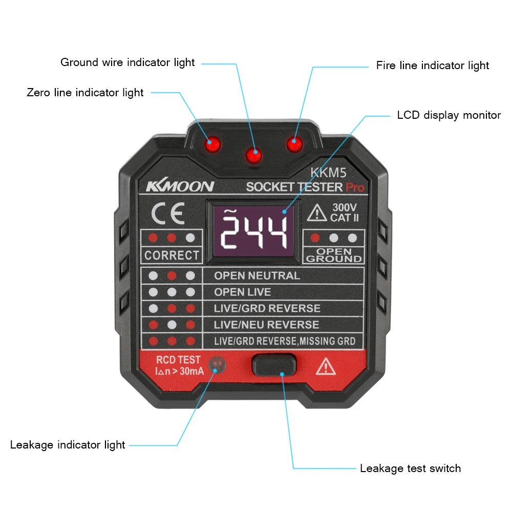 Тестер гнезда в основном используется для обнаружения электросети и тестирования RCD. Он может быстро и точно определить состояние проводки розетки.